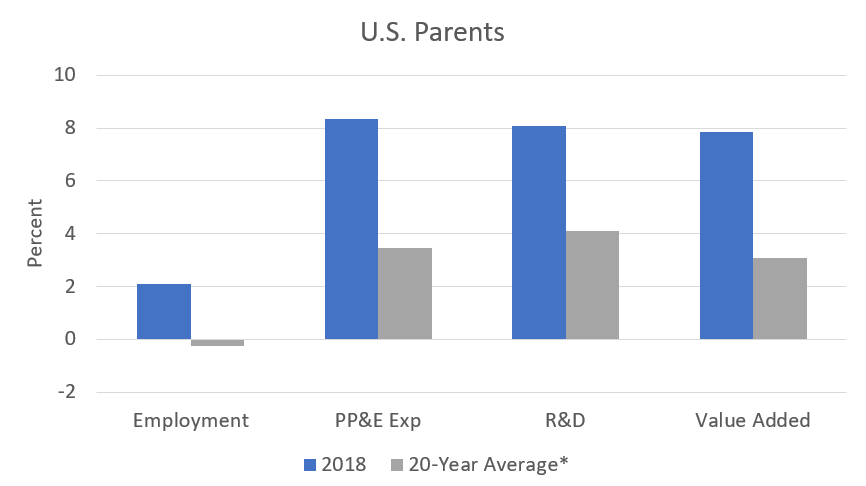 U.S. parents grew faster than MOFAs in 2018 for several measures of their activities, including employment, value added, expenditures for property, plant, and equipment (PP&E), and research and development expenditures (R&D). This contrasts with the long-term trend of MOFA activities growth outpacing that of U.S. parents. In 2018, U.S. parents experienced above-average growth rates for these measures, while MOFAs grew at below-average rates.