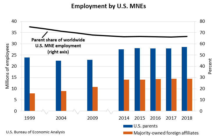 Worldwide employment by U.S. multinational enterprises (MNEs) increased 1.4 percent to 43.0 million workers in 2018 from 42.4 million in 2017, according to statistics released by the Bureau of Economic Analysis on the operations and finances of U.S. parent companies and their foreign affiliates.