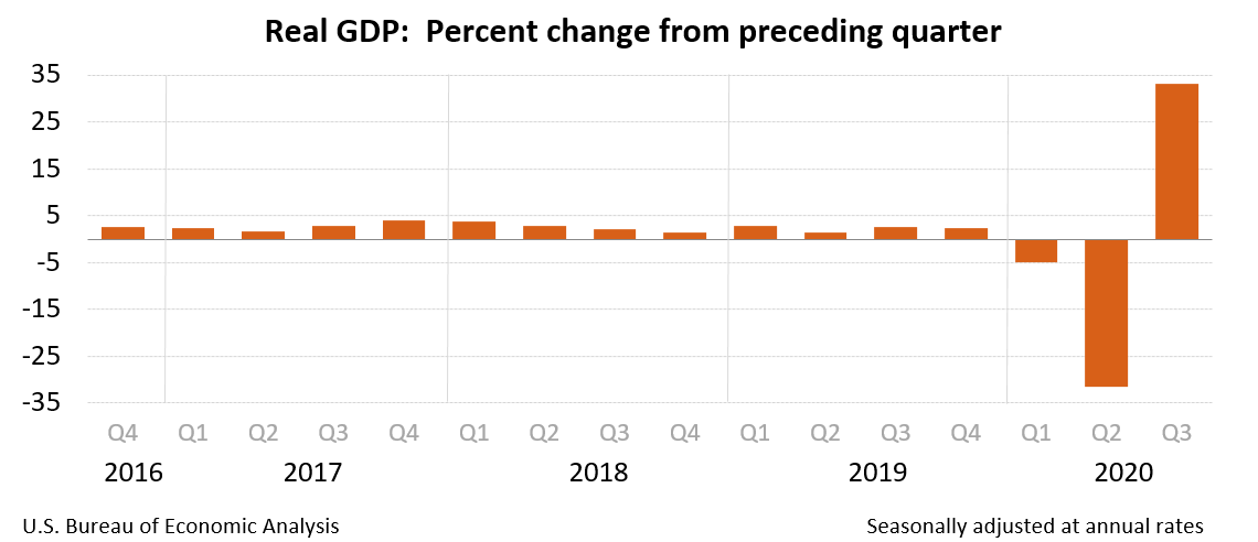 Real gross domestic product (GDP) increased at an annual rate of 33.1 percent in the third quarter of 2020 (table 1), according to the "second" estimate released by the Bureau of Economic Analysis. In the second quarter, real GDP decreased 31.4 percent.