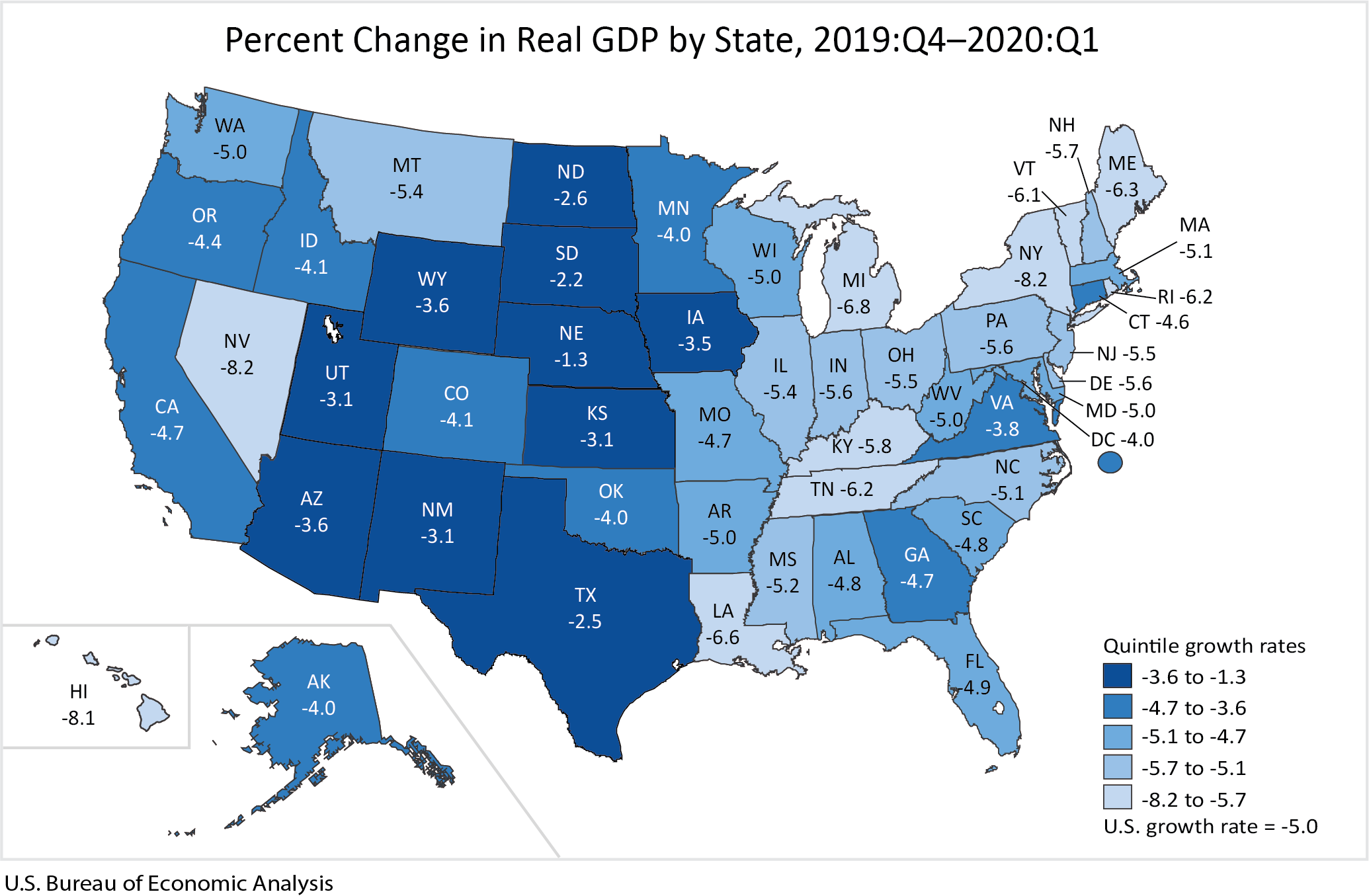 Real gross domestic product (GDP) decreased in all 50 states and the District of Columbia in the first quarter of 2020, according to statistics released today by the U.S. Bureau of Economic Analysis. The percent change in real GDP in the first quarter ranged from -1.3 percent in Nebraska to -8.2 percent in New York and Nevada (table 1).