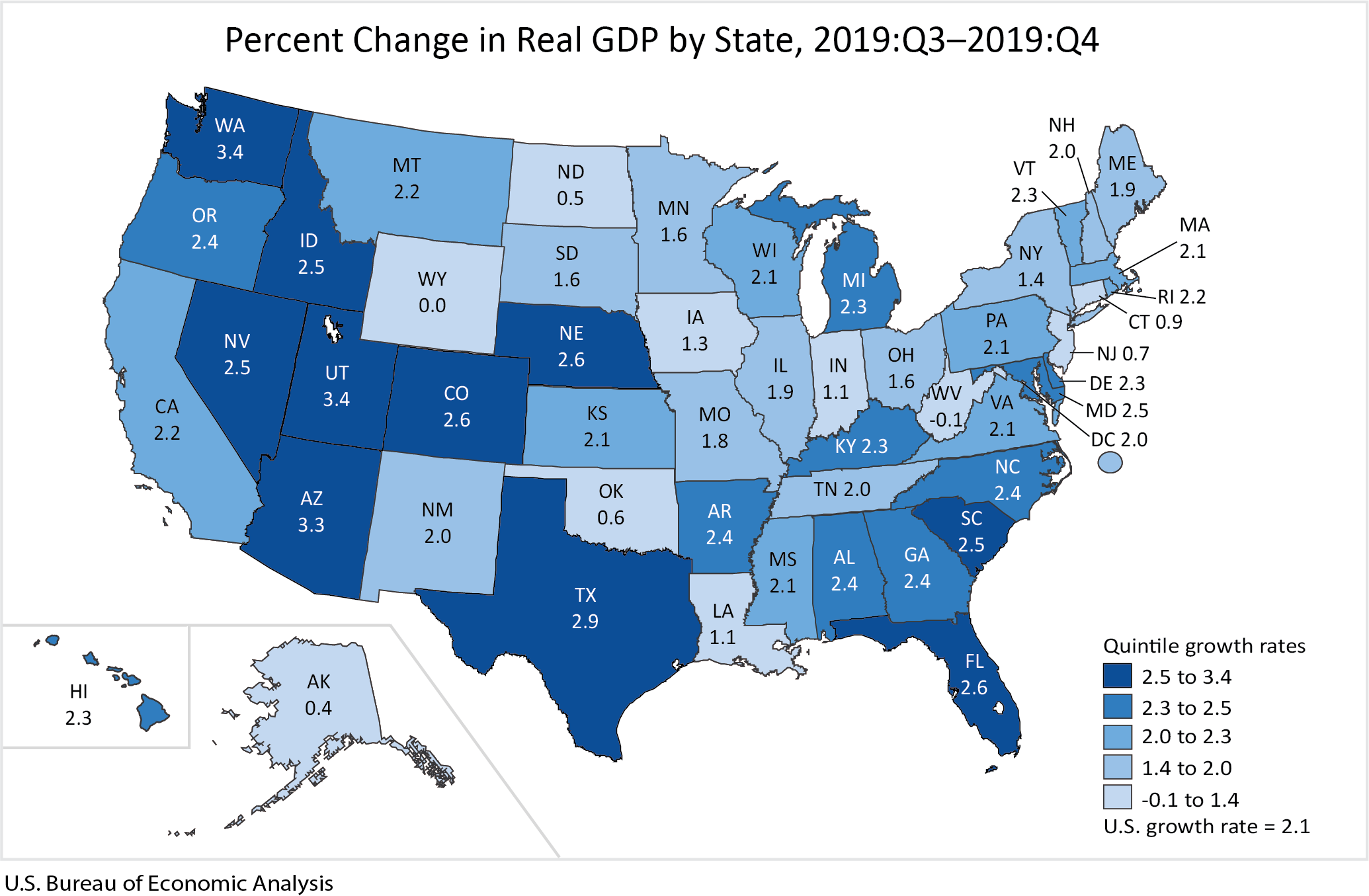 Real gross domestic product (GDP) increased in 48 states and the District of Columbia in the fourth quarter of 2019, according to statistics released today by the U.S. Bureau of Economic Analysis. The percent change in real GDP in the fourth quarter ranged from 3.4 percent in Washington and Utah to -0.1 percent in West Virginia (table 1).