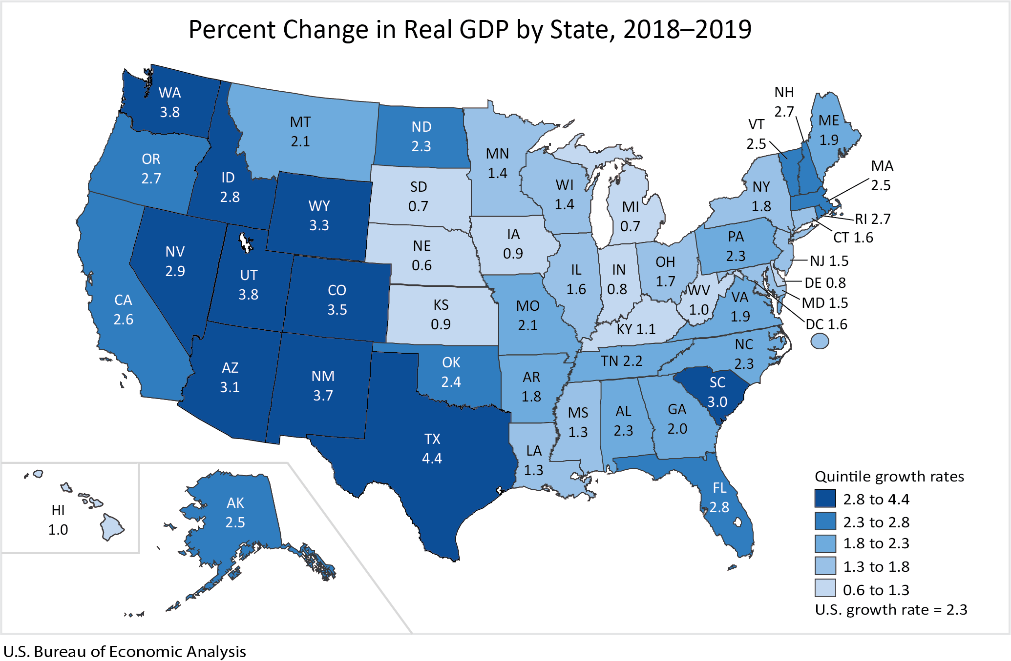 Real GDP increased in all 50 states and the District of Columbia in 2019. The percent change in real GDP ranged from 4.4 percent in Texas to 0.6 percent in Nebraska (table 4).