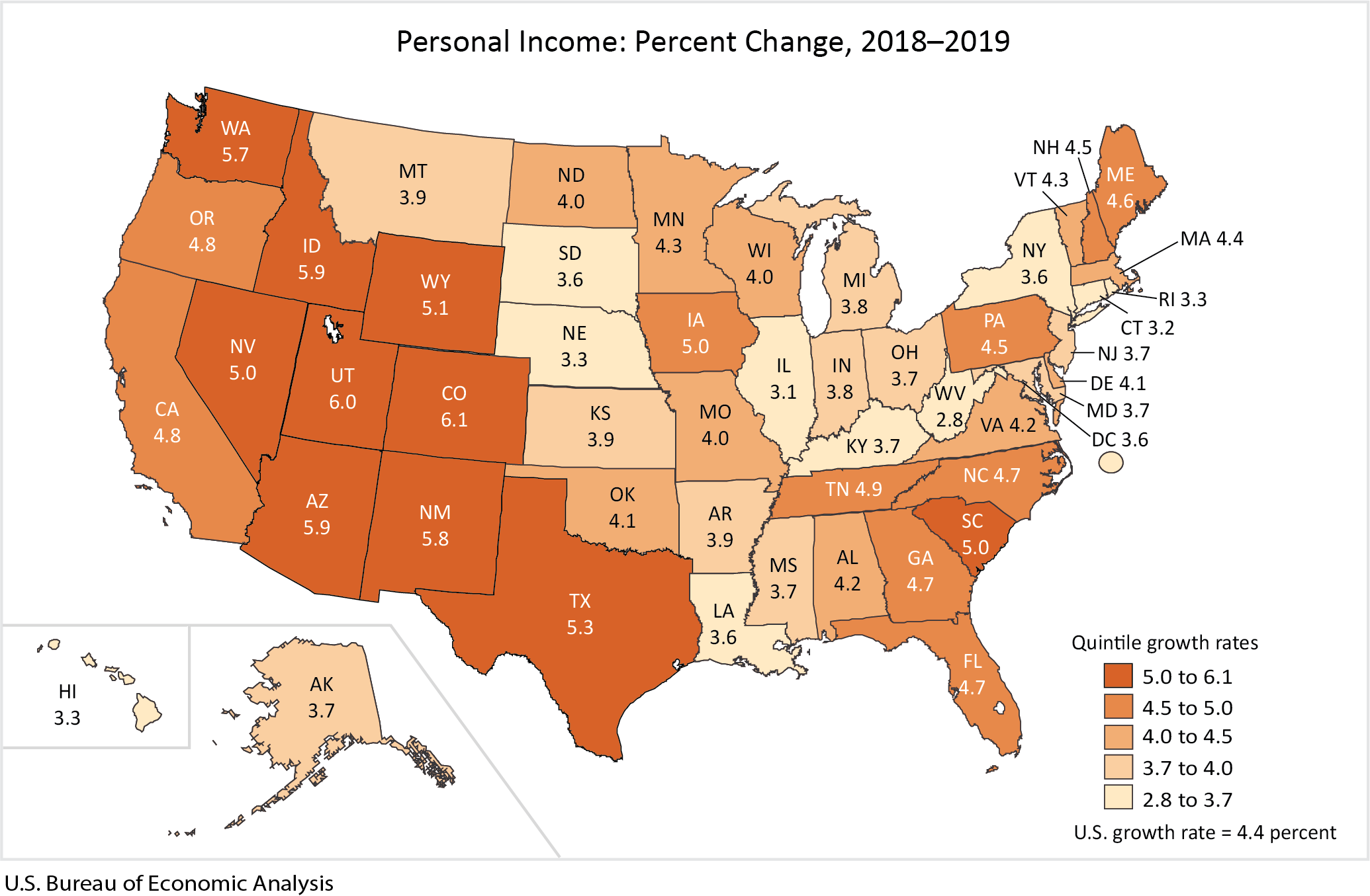 State personal income increased 4.4 percent in 2019, after increasing 5.6 percent in 2018, according to estimates released today by the Bureau of Economic Analysis (table 1). In 2019, increases in earnings, property income (dividends, interest, and rent), and transfer receipts contributed to personal income growth in all states and the District of Columbia (table 2). The percent change in personal income across all states ranged from 6.1 percent in Colorado to 2.8 percent in West Virginia.