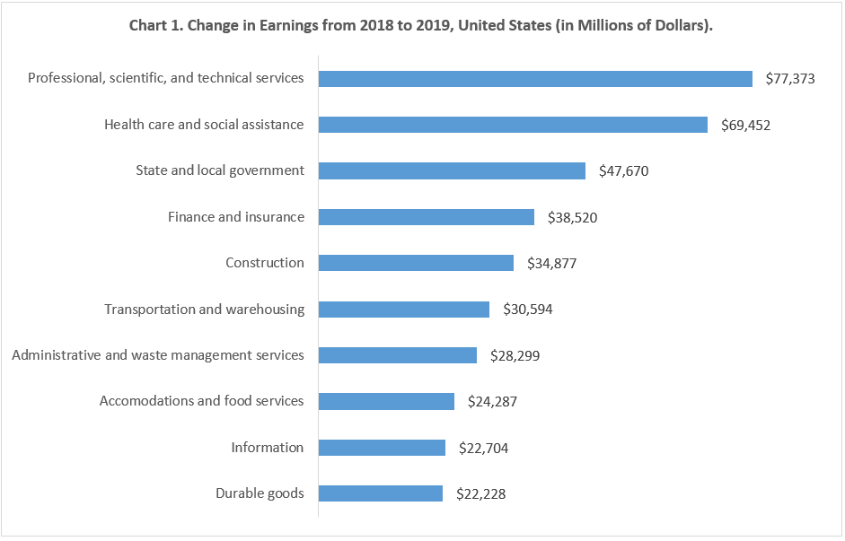 Earnings. For the nation, earnings increased 4.5 percent in 2019; increasing in all 24 industries for which BEA prepares estimates (table 4). Earnings growth in three industries—professional, scientific, and technical services; health care and social assistance; and state and local government—were the leading contributors to overall growth and were leading contributors to growth in the five fastest growing states—Colorado, Utah, Idaho, Arizona, and New Mexico.