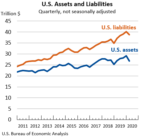 The U.S. net international investment position, the difference between U.S. residents’ foreign financial assets and liabilities, was –$12.06 trillion at the end of the first quarter of 2020, according to statistics released by the U.S. Bureau of Economic Analysis (BEA). Assets totaled $26.77 trillion and liabilities were $38.82 trillion.