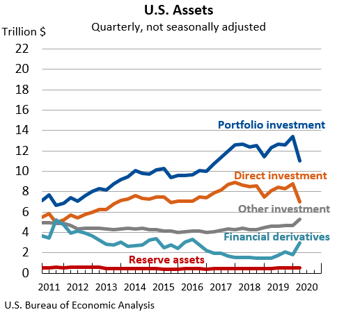 U.S. assets decreased by $2.39 trillion, to a total of $26.77 trillion, at the end of the first quarter, mostly reflecting decreases in portfolio investment and direct investment assets that were partly offset by increases in financial derivatives and in other investment assets. Portfolio investment assets decreased by $2.39 trillion, to $10.99 trillion, and direct investment assets decreased by $1.82 trillion, to $6.98 trillion, reflecting sharp decreases in foreign stock prices and the depreciation of major foreign currencies against the U.S. dollar that lowered the value of these assets in dollar terms. These large changes in asset prices reflected a sudden decrease in production and earnings as global economic activity was disrupted by the COVID-19 pandemic.