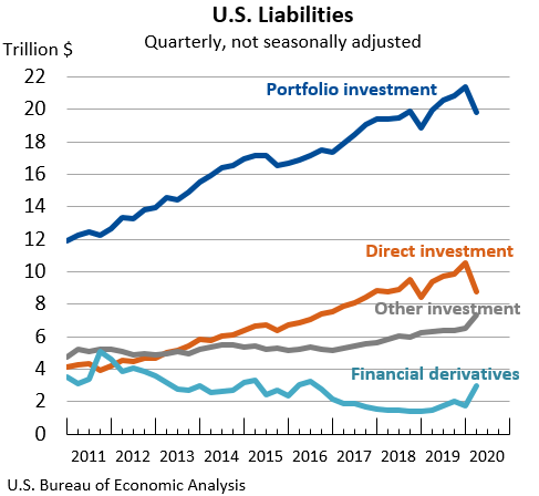 U.S. liabilities decreased by $1.38 trillion, to a total of $38.82 trillion, at the end of the first quarter, mostly reflecting decreases in direct investment and portfolio investment liabilities that were partly offset by increases in financial derivatives and in other investment liabilities. Direct investment liabilities decreased by $1.78 trillion, to $8.77 trillion, and portfolio investment liabilities decreased by $1.61 trillion, to $19.78 trillion, mostly reflecting decreases in U.S. stock prices amid the COVID-19 pandemic.