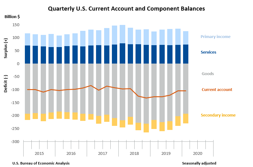 The U.S. current account deficit, which reflects the combined balances on trade in goods and services and income flows between U.S. residents and residents of other countries, narrowed by $0.1 billion, or 0.1 percent, to $104.2 billion in the first quarter of 2020, according to statistics from the U.S. Bureau of Economic Analysis (BEA). The revised fourth quarter deficit was $104.3 billion.