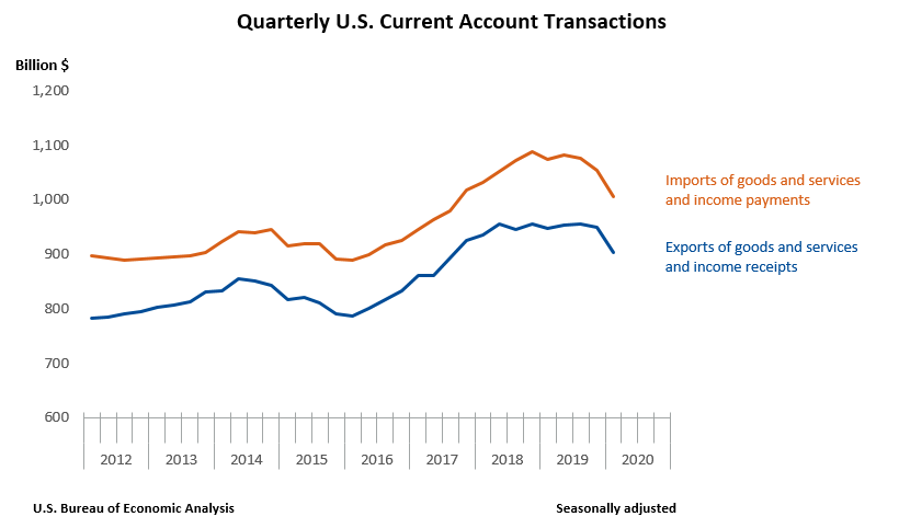 Exports of goods and services to, and income received from, foreign residents decreased $47.5 billion, to $902.3 billion, in the first quarter. Imports of goods and services from, and income paid to, foreign residents decreased $47.7 billion, to $1.01 trillion.