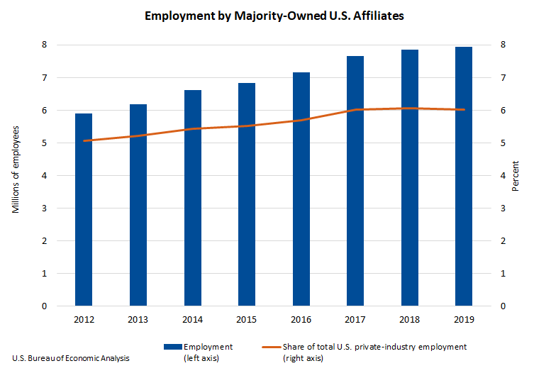 Majority-owned U.S. affiliates (MOUSAs) of foreign multinational enterprises (MNEs) employed 7.95 million workers in the United States in 2019, a 1.1 percent increase from 7.86 million in 2018, according to statistics on MOUSA operations and finances released by the Bureau of Economic Analysis.