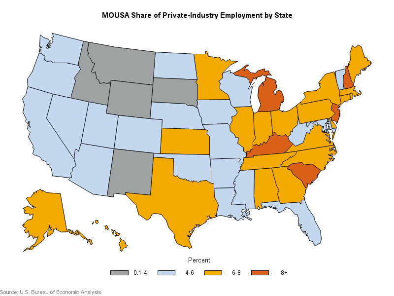 By state, private-industry employment accounted for by MOUSAs was highest in South Carolina (8.9 percent), New Hampshire (8.4 percent), and Kentucky (8.2 percent). In all three states, MOUSAs in the manufacturing industry employed the most workers.