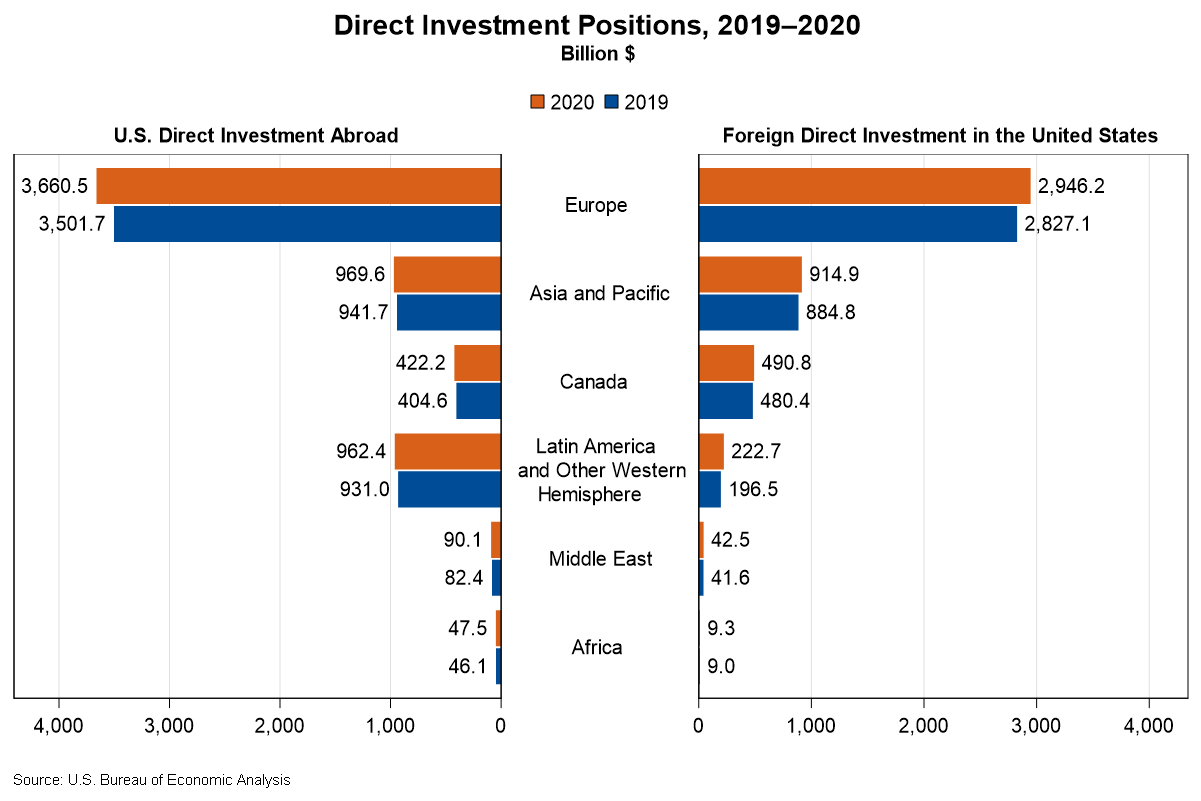 The foreign direct investment in the United States position increased $187.2 billion to $4.63 trillion at the end of 2020 from $4.44 trillion at the end of 2019. The increase mainly reflected a $119.2 billion increase in the position from Europe, primarily Germany. By industry, affiliates in manufacturing, finance and insurance, and wholesale trade accounted for the majority of the increase.