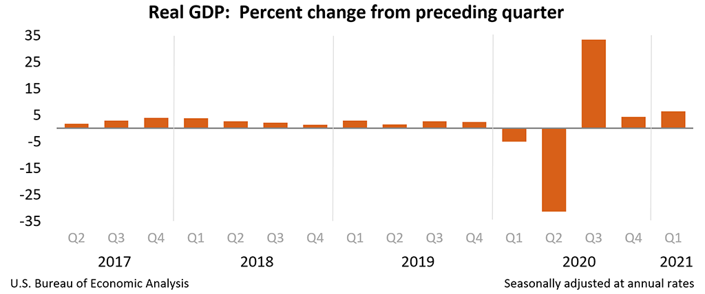 Real gross domestic product (GDP) increased at an annual rate of 6.4 percent in the first quarter of 2021 (table 1), according to the "second" estimate released by the Bureau of Economic Analysis. In the fourth quarter of 2020, real GDP increased 4.3 percent.