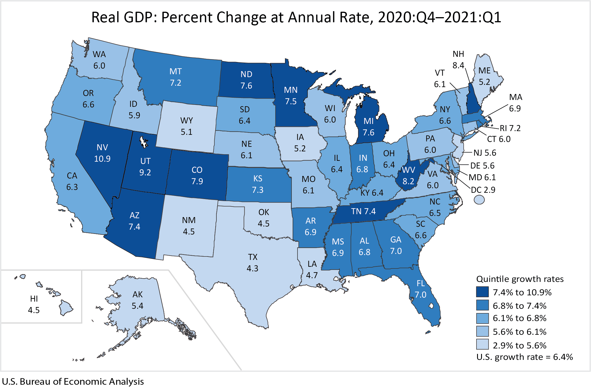 Real gross domestic product (GDP) increased in all 50 states and the District of Columbia in the first quarter of 2021, as real GDP for the nation increased at an annual rate of 6.4 percent, according to statistics released today by the U.S. Bureau of Economic Analysis. The percent change in real GDP in the first quarter ranged from 10.9 percent in Nevada to 2.9 percent in the District of Columbia (table 1).