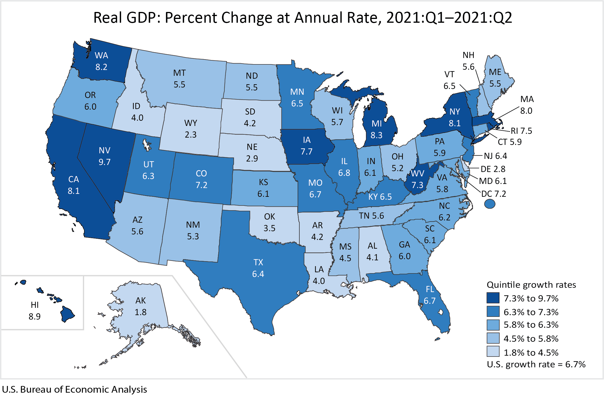 Real gross domestic product (GDP) increased in all 50 states and the District of Columbia in the second quarter of 2021, as real GDP for the nation increased at an annual rate of 6.7 percent, according to statistics released today by the U.S. Bureau of Economic Analysis. The percent change in real GDP in the second quarter ranged from 9.7 percent in Nevada to 1.8 percent in Alaska (table 1).