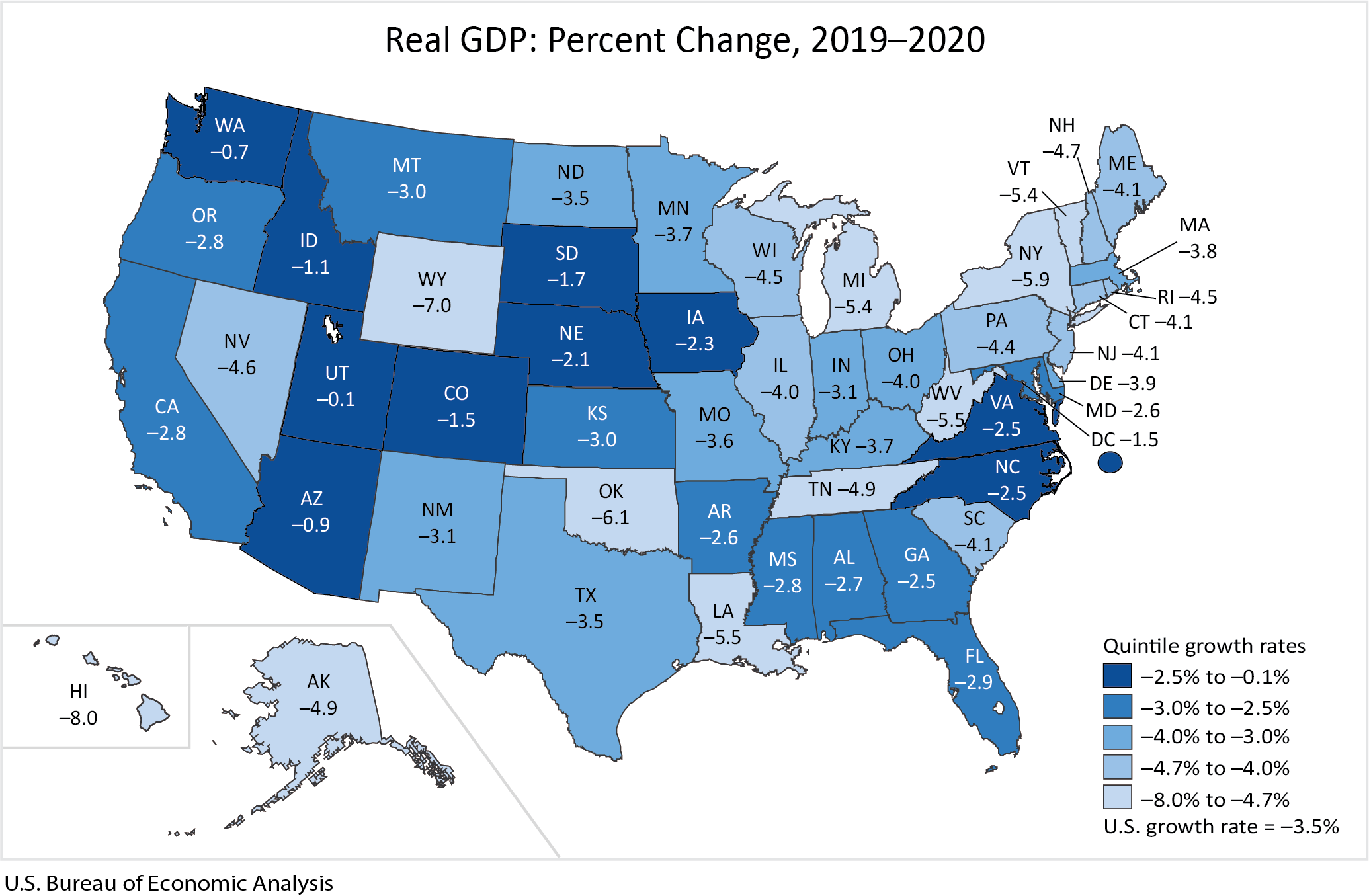 Real GDP decreased in all 50 states and the District of Columbia in 2020. The percent change in real GDP ranged from –0.1 percent in Utah to –8.0 percent in Hawaii (table 4).