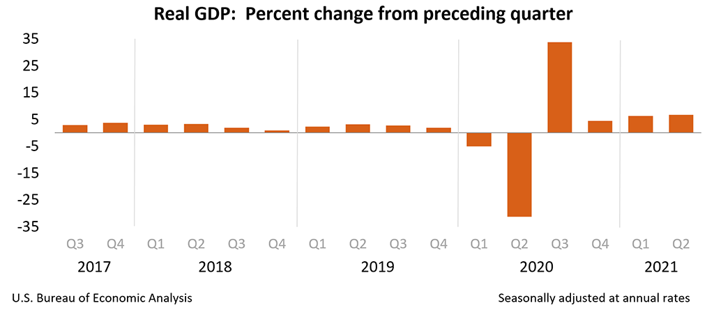 Real gross domestic product (GDP) increased at an annual rate of 6.7 percent in the second quarter of 2021 (table 1), according to the "third" estimate released by the Bureau of Economic Analysis. In the first quarter, real GDP increased 6.3 percent.