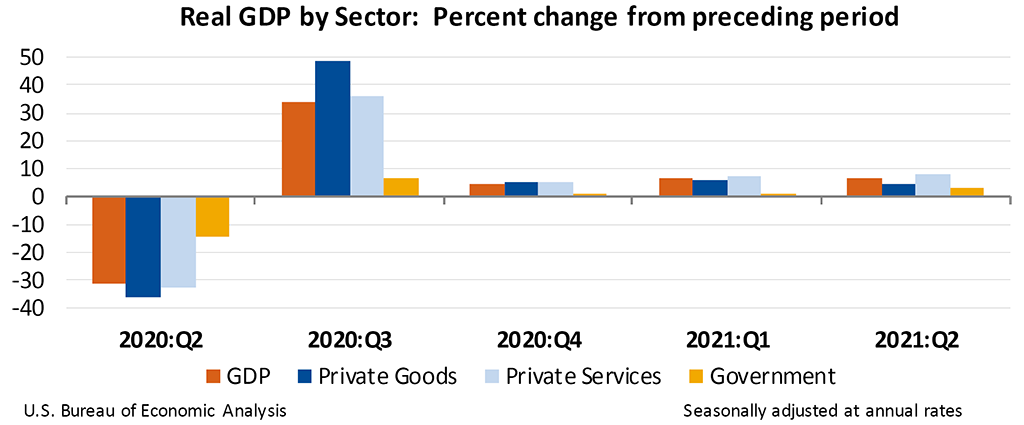 Today's release includes estimates of GDP by industry, or value added—a measure of an industry's contribution to GDP. In the second quarter, private goods-producing industries increased 4.7 percent, private services-producing industries increased 7.8 percent, and government increased 3.4 percent (table 12). Overall, 19 of 22 industry groups contributed to the second-quarter increase in real GDP.