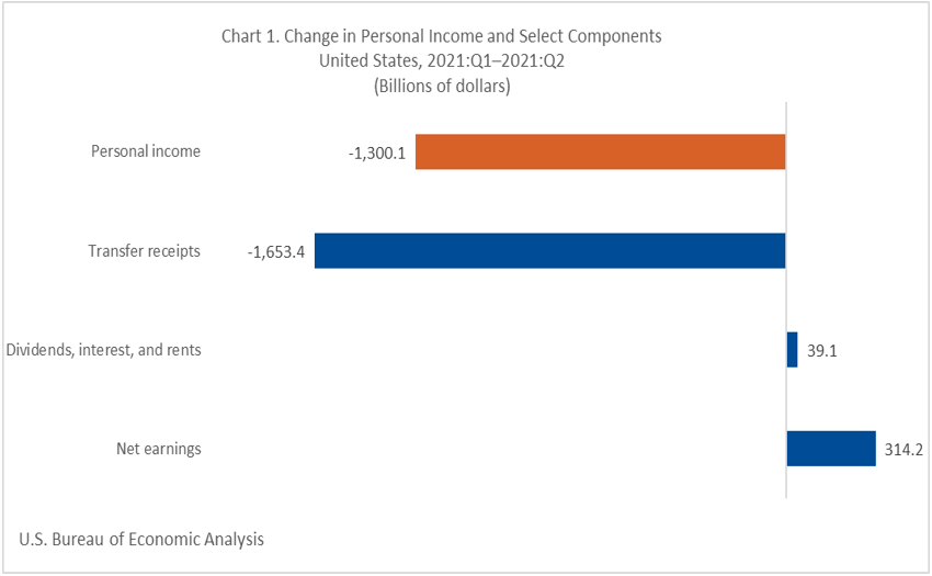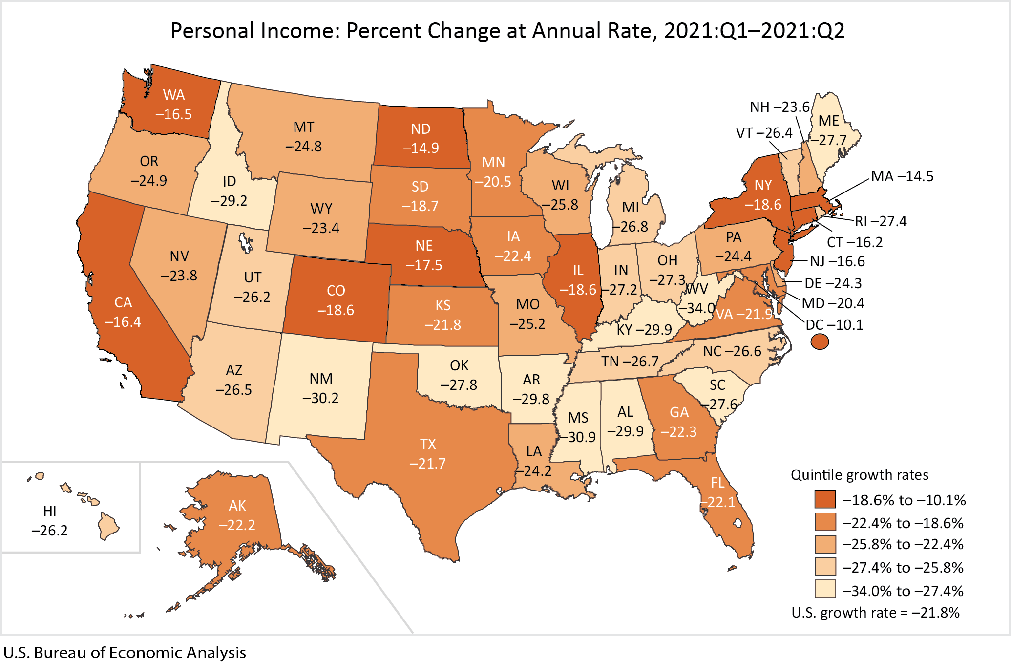 State personal income decreased 21.8 percent at an annual rate in the second quarter of 2021 after increasing 56.9 percent in the first quarter, according to estimates released today by the U.S. Bureau of Economic Analysis (BEA) (table 1). In the second quarter of 2021, the decrease in transfer receipts was the leading contributor to personal income declines in all 50 states and the District of Columbia (table 2). The percent change in personal income across all states ranged from –10.1 percent in the District of Columbia to –34.0 percent in West Virginia.