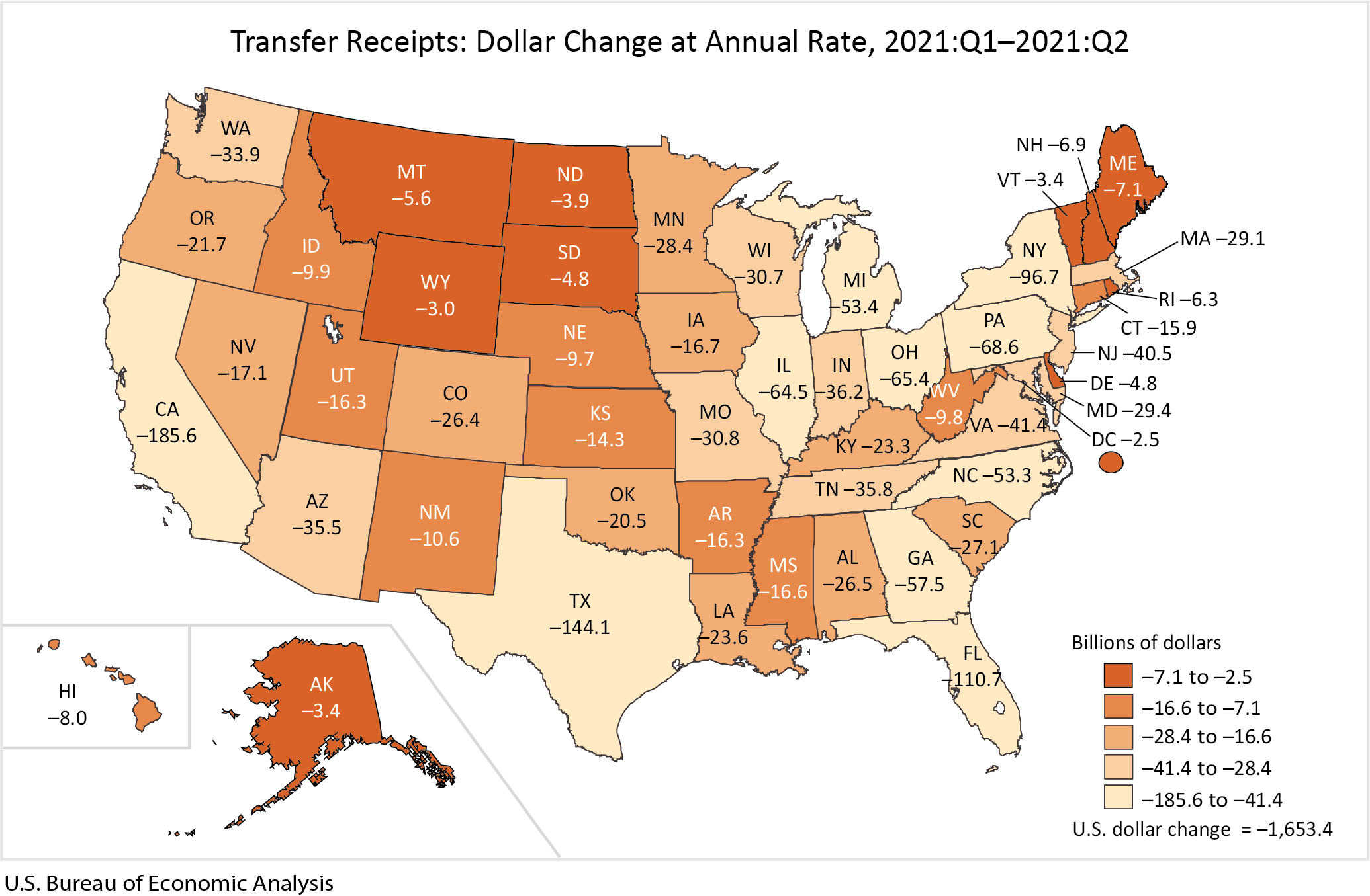 Transfer receipts decreased $1.7 trillion for the nation in the second quarter of 2021, accounting for more than the entire $1.3 trillion decrease in personal income (chart 1).