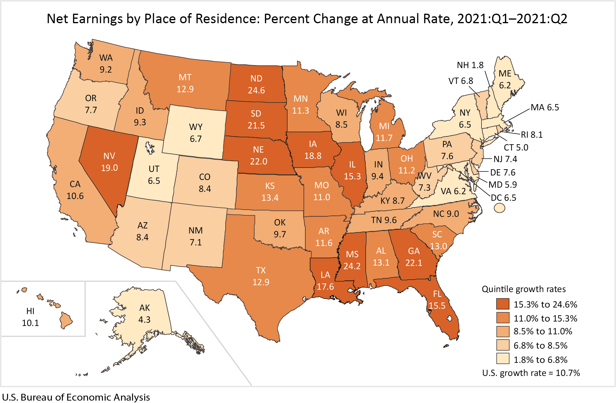 Earnings. For the nation, earnings increased 10.7 percent in the second quarter of 2021 after increasing 2.6 percent in the first quarter (table 2). The increase in earnings reflected the continued economic recovery following the partial economic shutdown that began in the first quarter of 2020 after the start of the COVID-19 pandemic.