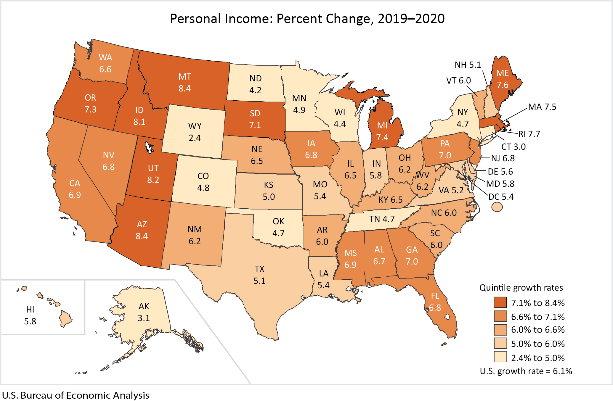 State personal income increased 6.1 percent in 2020 after increasing 3.9 percent in 2019, according to estimates released today by the Bureau of Economic Analysis (BEA) (table 1). In 2020, the increase in transfer receipts was the leading contributor to personal income growth in all states and the District of Columbia (table 2). The percent change in personal income across all states ranged from 8.4 percent in Arizona and Montana to 2.4 percent in Wyoming.