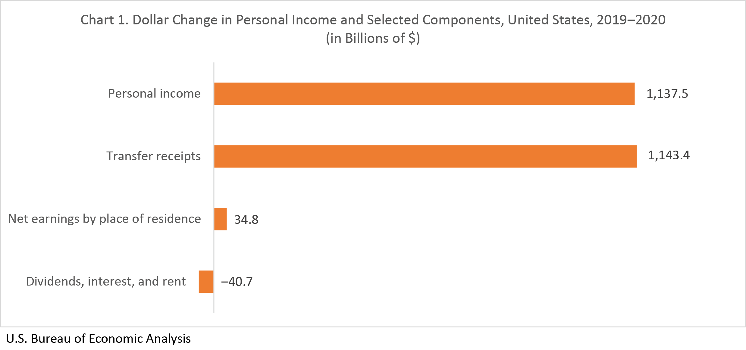 Transfer receipts increased 36.6 percent, accounting for the entire $1.1 trillion dollar increase in personal income for the nation in 2020 (chart 1). The increase in transfer receipts reflected new government relief payments provided by the Coronavirus Aid, Relief, and Economic Security (CARES) Act of 2020. Increases in earnings were more than offset by decreases in property income (dividends, interest, and rent).