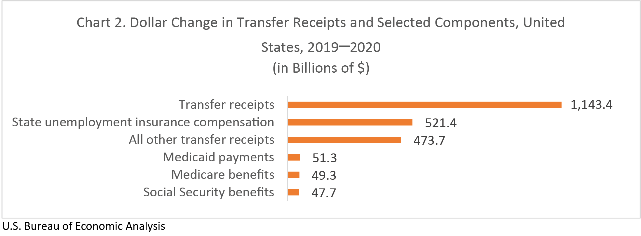 State unemployment insurance compensation was boosted by a temporary $600 increase in weekly benefits provided by the CARES Act as well as an expansion of eligibility of workers not previously covered by state unemployment compensation programs. The increase in all other transfers primarily reflected the $1,200 economic impact payments to individuals.