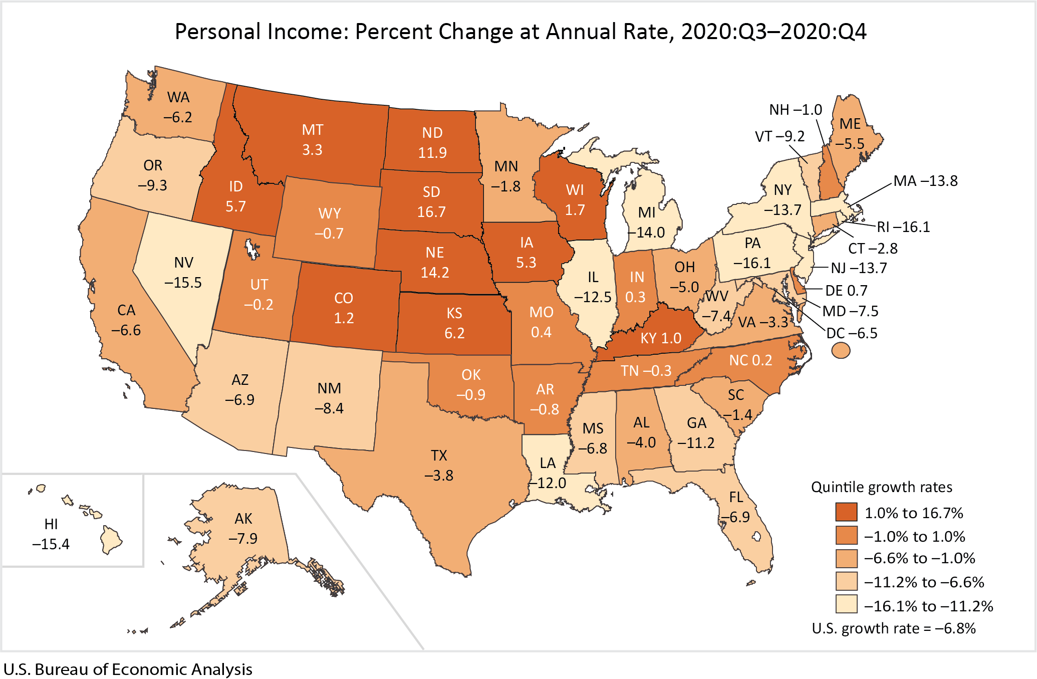 State personal income decreased 6.8 percent at an annual rate in the fourth quarter of 2020 after decreasing 11.3 percent in the third quarter (table 5). Increases in earnings and property income were more than offset by decreases in transfer receipts. The percent change in personal income across all states ranged from 16.7 percent in South Dakota to –16.1 percent in Rhode Island and Pennsylvania (table 6).