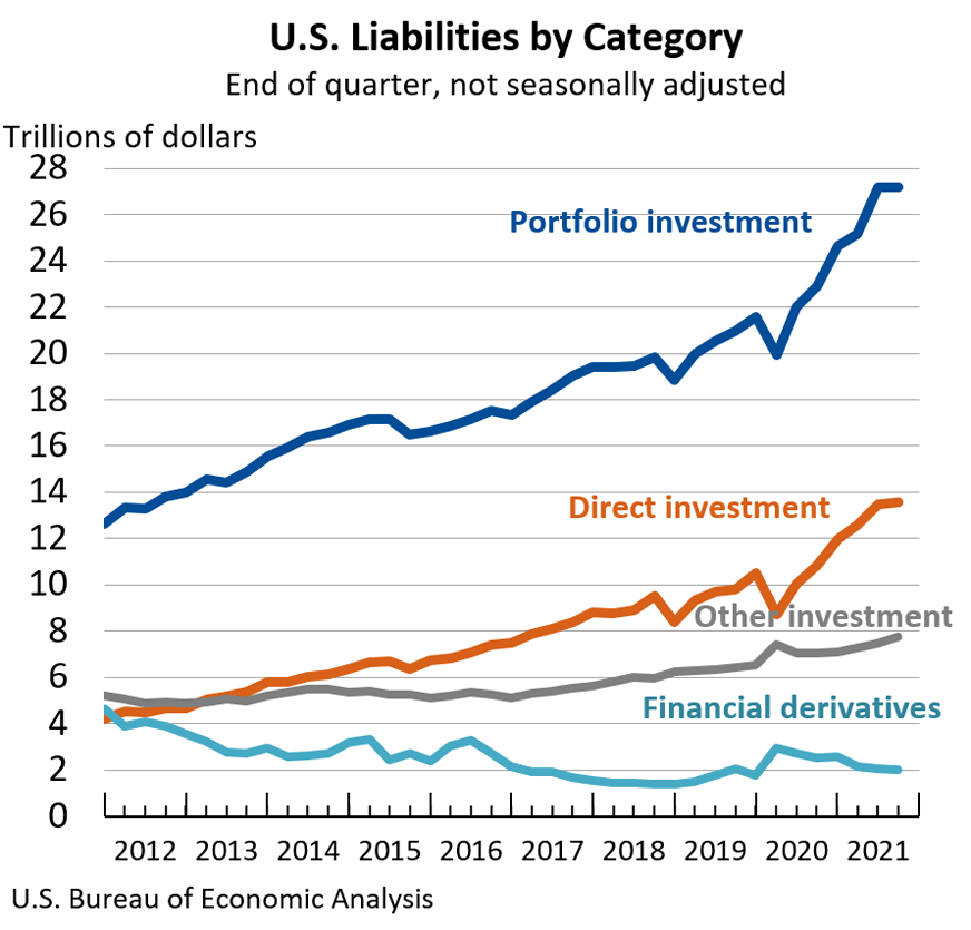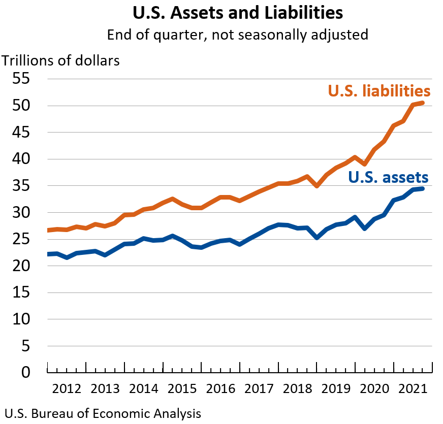 The U.S. net international investment position (IIP), the difference between U.S. residents' foreign financial assets and liabilities, was –$16.07 trillion at the end of the third quarter of 2021, according to statistics released today by the U.S. Bureau of Economic Analysis (BEA). Assets totaled $34.45 trillion, and liabilities were $50.53 trillion. At the end of the second quarter, the net investment position was –$15.91 trillion. The net investment positions and components of assets and liabilities are presented in table 1.