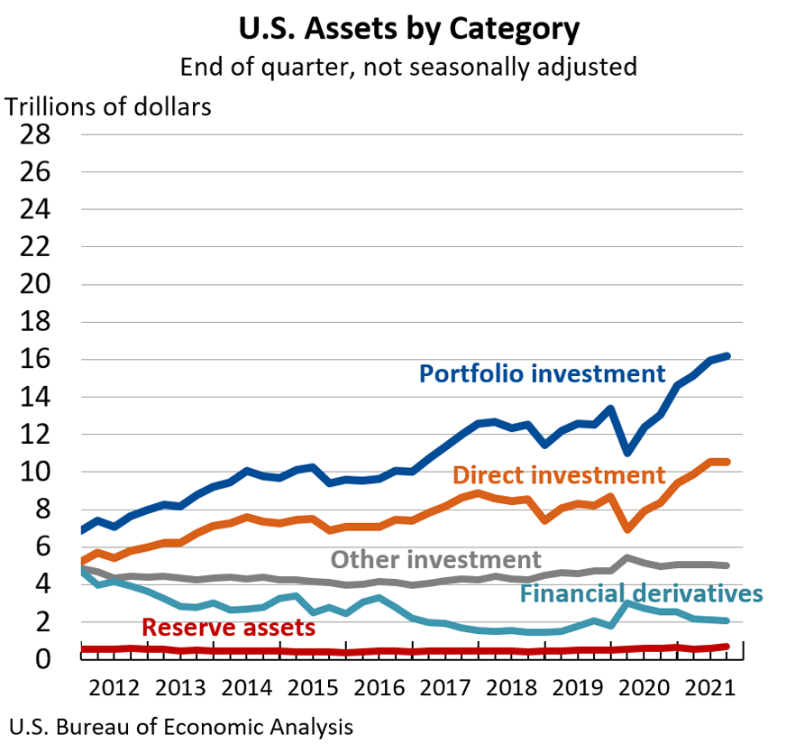 U.S. assets increased by $181.2 billion to a total of $34.45 trillion at the end of the third quarter, reflecting increases in portfolio investment and reserve assets. Portfolio investment assets increased by $194.3 billion to $16.16 trillion, driven by net U.S. purchases of foreign securities. Reserve assets increased by $105.0 billion to $695.1 billion, reflecting the allocation of $112.8 billion in new special drawing rights (SDRs) in August 2021 to the United States as its share of the $650 billion SDR allocation approved by the International Monetary Fund (IMF). The SDR is an international reserve asset created by the IMF to supplement its member countries' official reserves and can be exchanged between members for currencies such as the U.S. dollar, the euro, or the yen. The allocation in the third quarter was the largest in the history of the IMF.