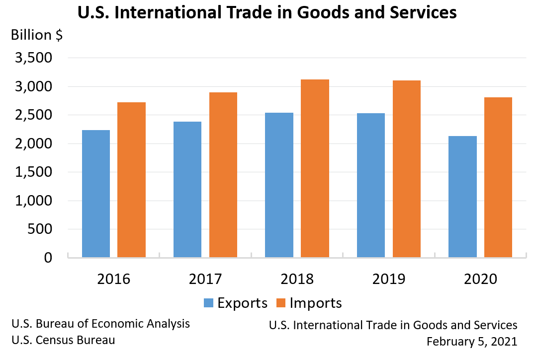 Exports and imports in December 2020 reflect both the ongoing impact of the COVID-19 pandemic and the continued economic recovery from the sharp declines earlier in the year. The full economic effects of the pandemic cannot be quantified in the trade statistics because the impacts are generally embedded in source data and cannot be separately identified. The Census Bureau and the Bureau of Economic Analysis continue to monitor data quality and have determined estimates in this release meet publication standards. For more information, see the frequently asked questions on goods from the Census Bureau and on services from BEA.
