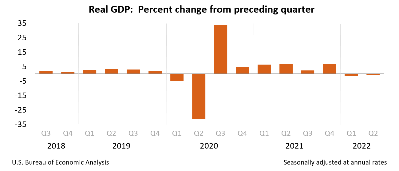 Real gross domestic product (GDP) decreased at an annual rate of 0.9 percent in the second quarter of 2022 (table 1), according to the "advance" estimate released by the Bureau of Economic Analysis. In the first quarter, real GDP decreased 1.6 percent.