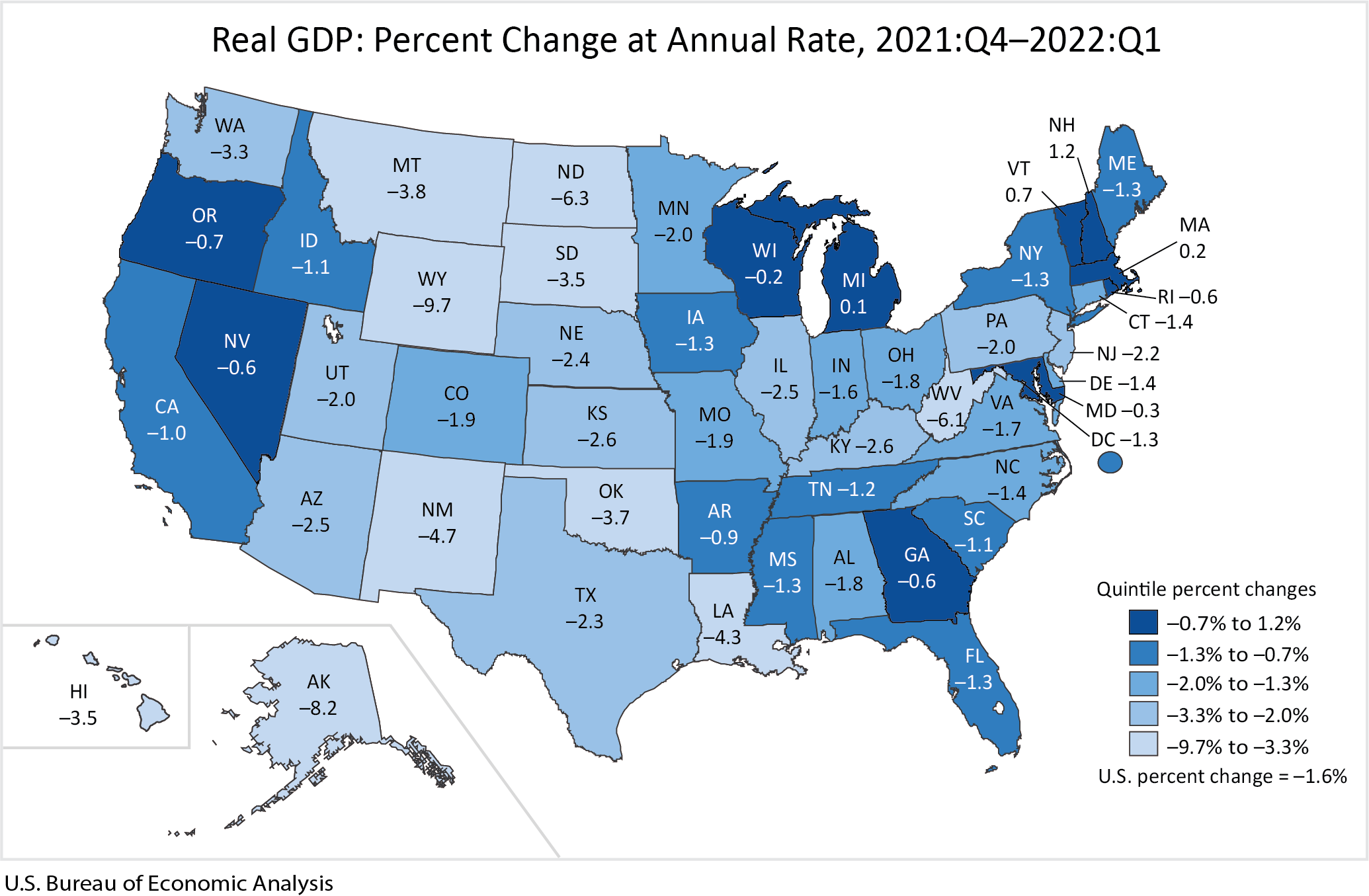 Real gross domestic product (GDP) decreased in 46 states and the District of Columbia in the first quarter of 2022, as real GDP for the nation decreased at an annual rate of 1.6 percent, according to statistics released today by the U.S. Bureau of Economic Analysis (BEA). The percent change in real GDP in the first quarter ranged from 1.2 percent in New Hampshire to –9.7 percent in Wyoming (table 1).