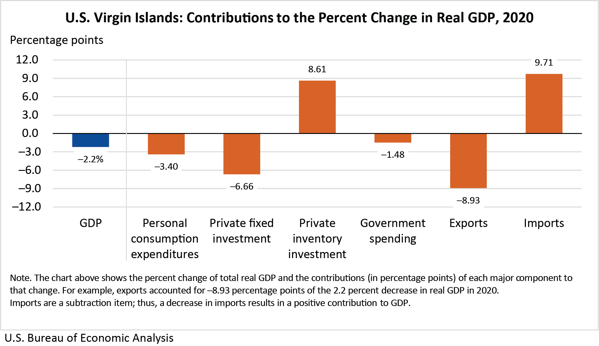 Real gross domestic product (GDP) for the U.S. Virgin Islands (USVI) decreased 2.2 percent in 2020 after increasing 2.8 percent in 2019 (table 1.3), according to statistics released today by the U.S. Bureau of Economic Analysis (BEA). These statistics were developed under the Statistical Improvement Program funded by the Office of Insular Affairs (OIA) of the U.S. Department of the Interior.
