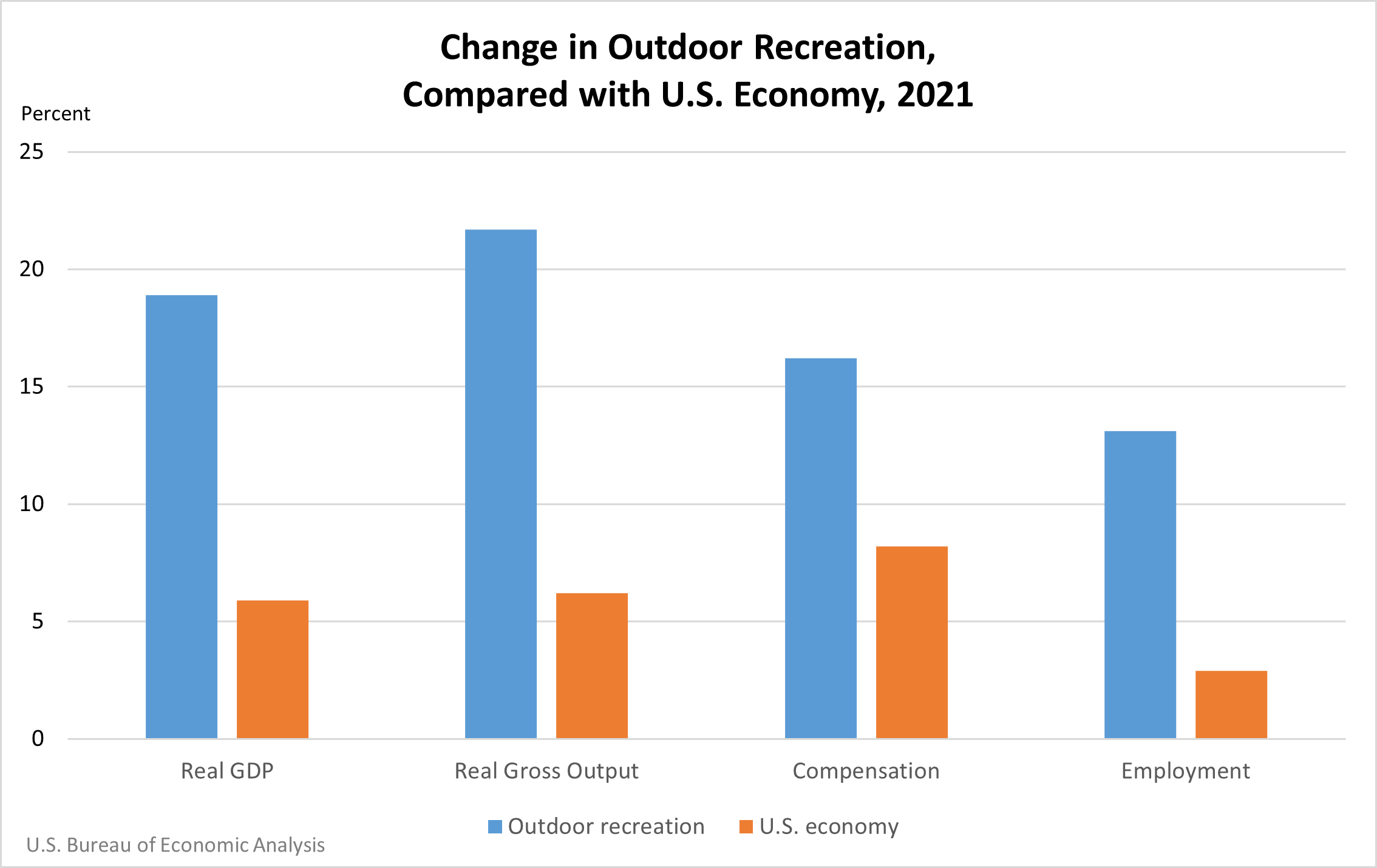 Inflation-adjusted ("real") GDP for the outdoor recreation economy increased 18.9 percent in 2021, compared with a 5.9 percent increase for the overall U.S. economy, reflecting a rebound in outdoor recreation after the decrease of 21.6 percent in 2020. Real gross output for the outdoor recreation economy increased 21.7 percent, while outdoor recreation compensation increased 16.2 percent and employment increased 13.1 percent.