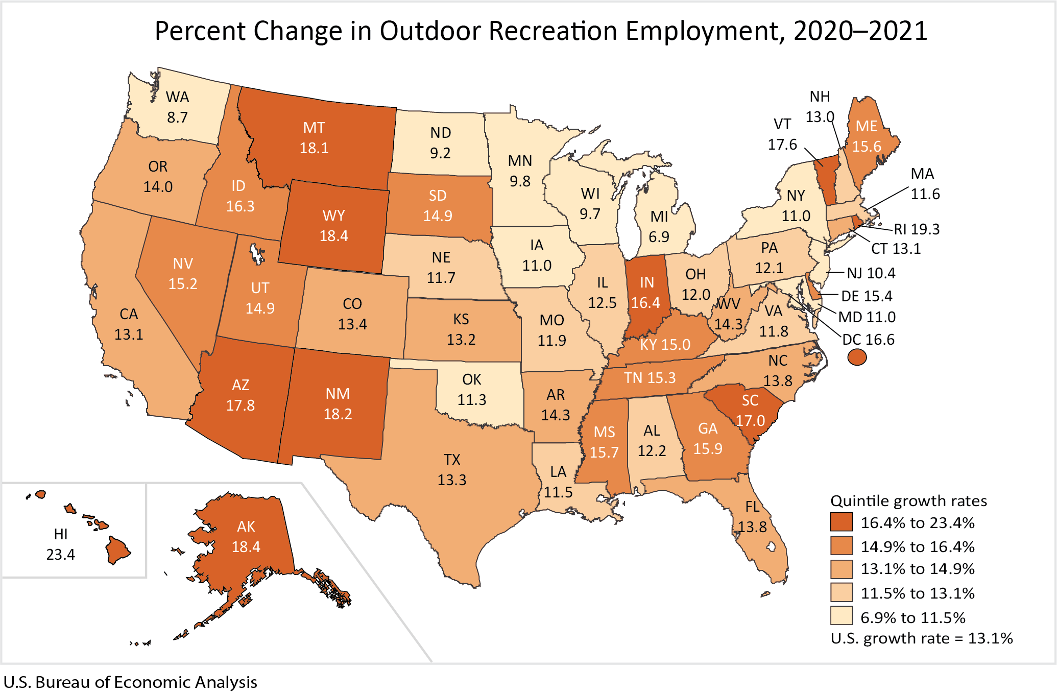 Across all 50 states and the District of Columbia outdoor recreation employment increased in 2021, ranging from 23.4 percent in Hawaii to 6.9 percent in Michigan.