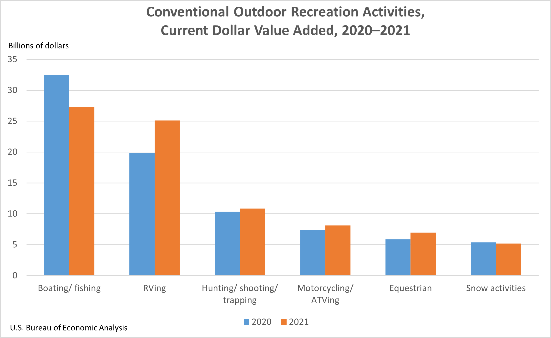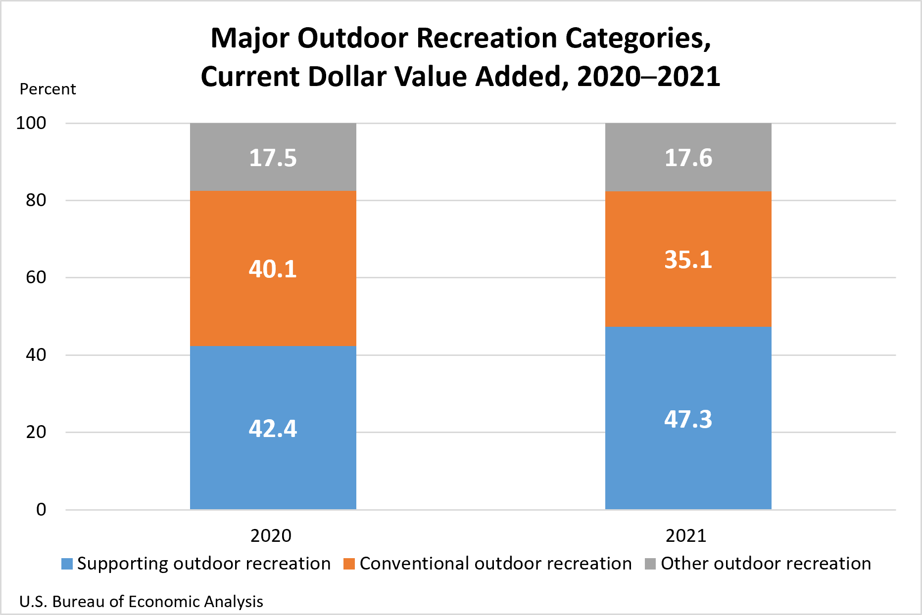 In 2021, conventional outdoor recreation accounted for 35.1 percent of U.S. outdoor recreation value added, compared with 40.1 percent in 2020. Other outdoor recreation accounted for 17.6 percent of value added in 2021, compared with 17.5 percent in 2020. Supporting activities accounted for the remaining 47.3 percent of value added in 2021, compared with 42.4 percent in 2020. Supporting activities, particularly travel and tourism-related activities, rebounded in 2021 as COVID–19 restrictions eased and consumers traveled more and increased spending on transportation, hotels, and restaurants.