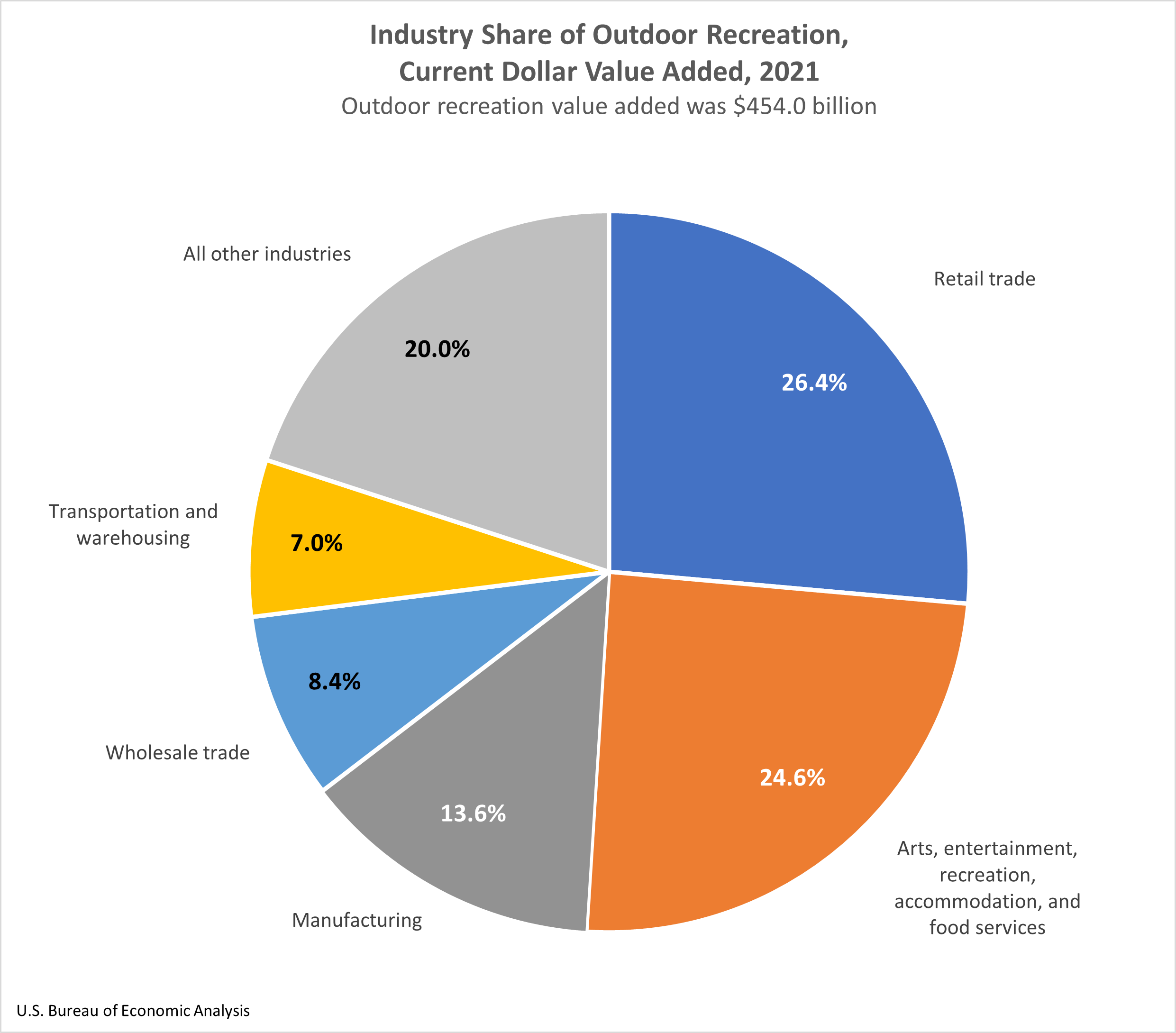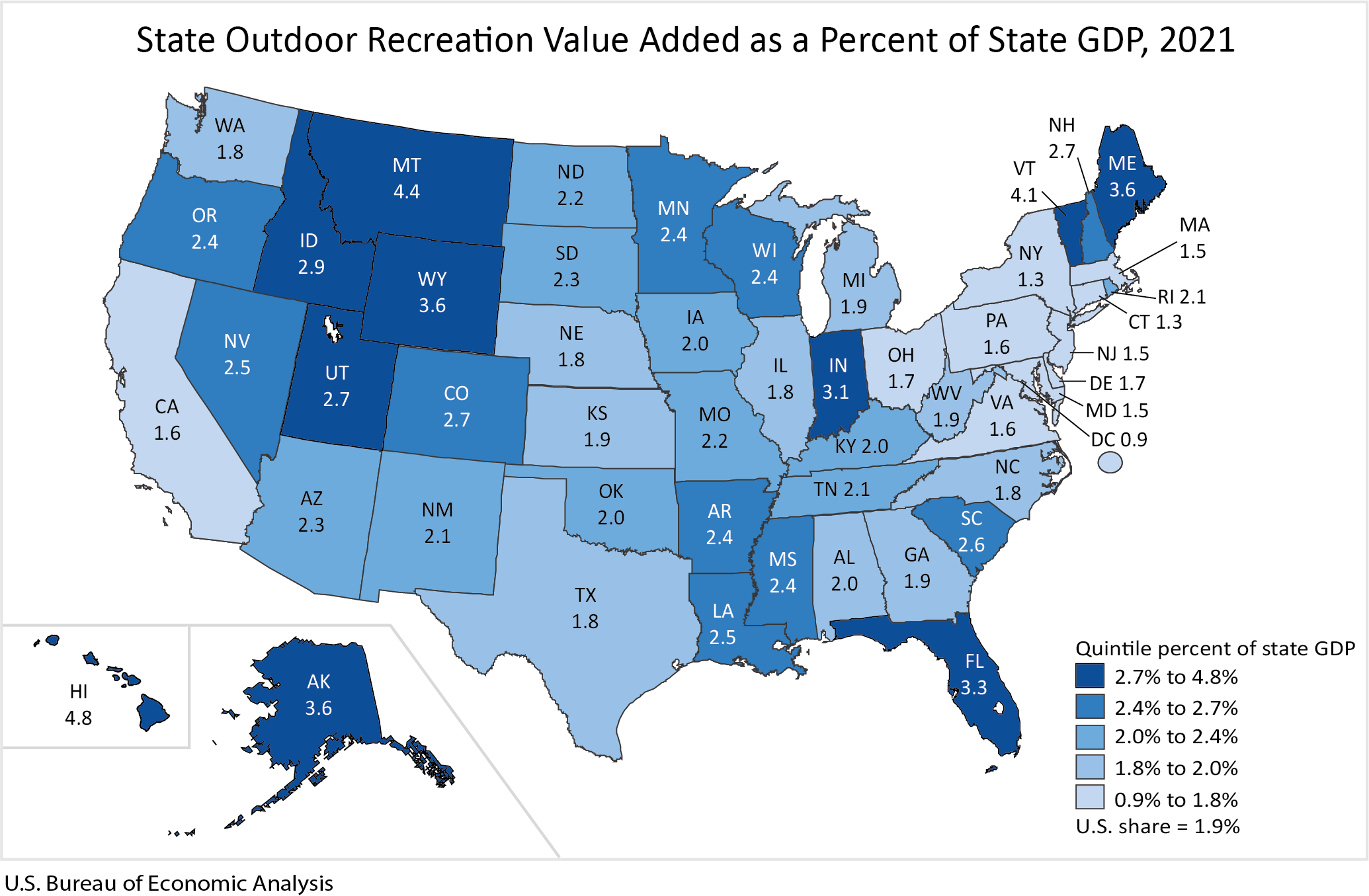 The U.S. Bureau of Economic Analysis released statistics today measuring the outdoor recreation economy for the nation, all 50 states, and the District of Columbia. The new U.S. data show that the outdoor recreation economy accounted for 1.9 percent ($454.0 billion) of current-dollar gross domestic product (GDP) for the nation in 2021 (national table 3). At the state level, value added for outdoor recreation as a share of state GDP ranged from 4.8 percent in Hawaii to 1.3 percent in New York and Connecticut. The share was 0.9 percent in the District of Columbia.