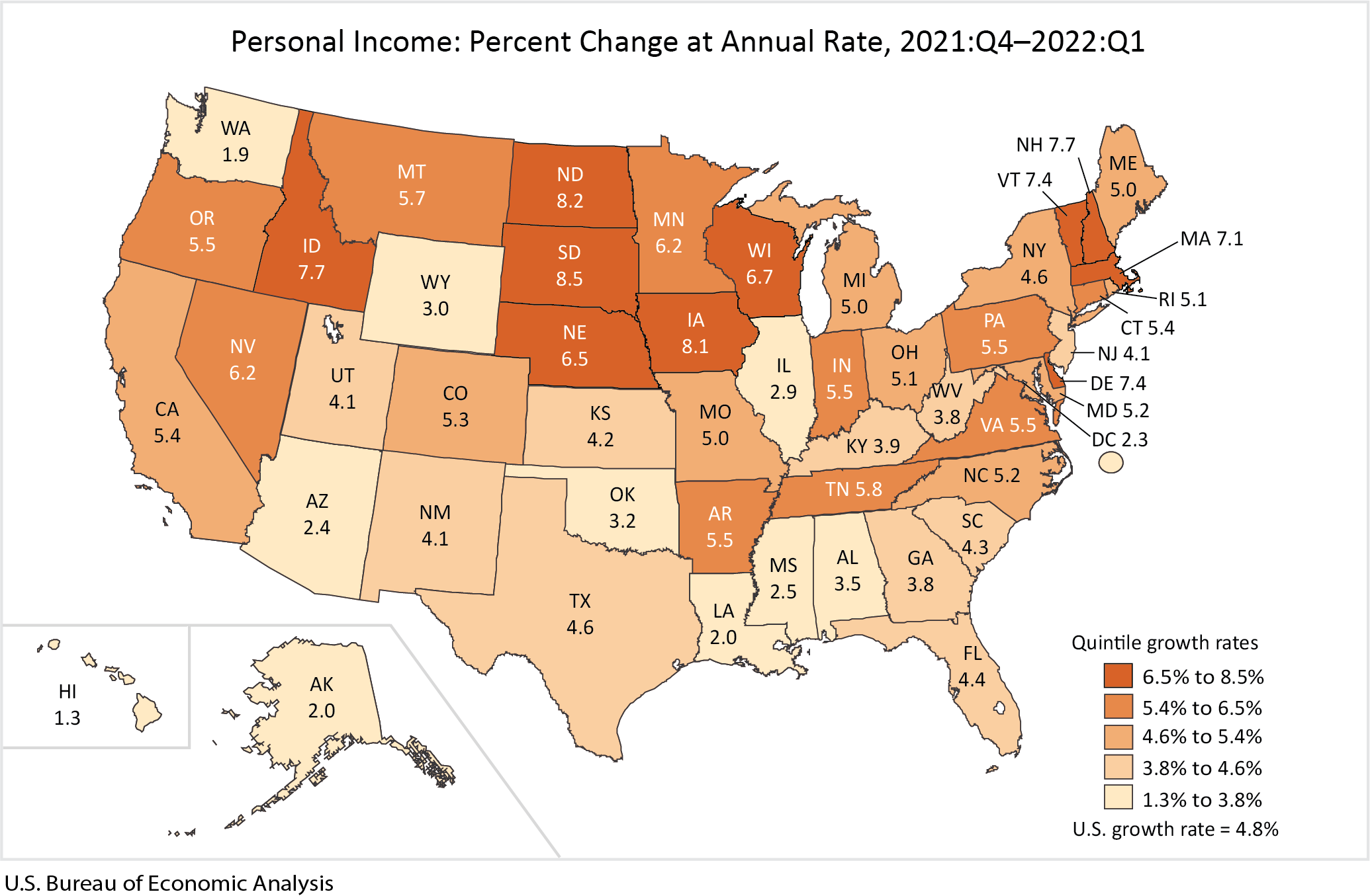 State personal income increased 4.8 percent at an annual rate in the first quarter of 2022 after increasing 3.6 percent in the fourth quarter of 2021, according to estimates released today by the U.S. Bureau of Economic Analysis (BEA) (table 1). The percent change in personal income across all states ranged from 8.5 percent in South Dakota to 1.3 percent in Hawaii.