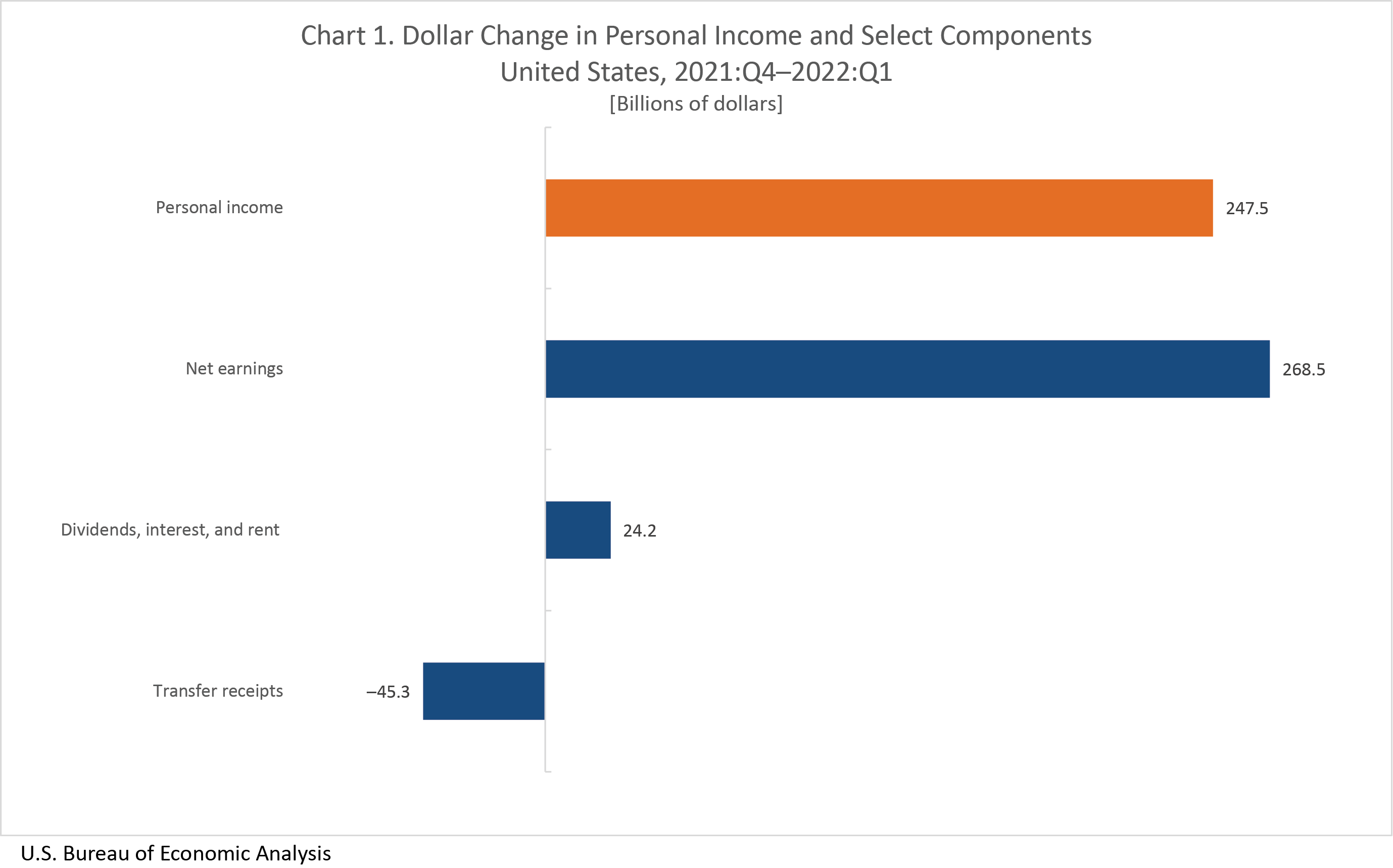 In the first quarter of 2022, increases in earnings and property income (dividends, interest, and rent) more than offset a decrease in transfer receipts (chart 1).
