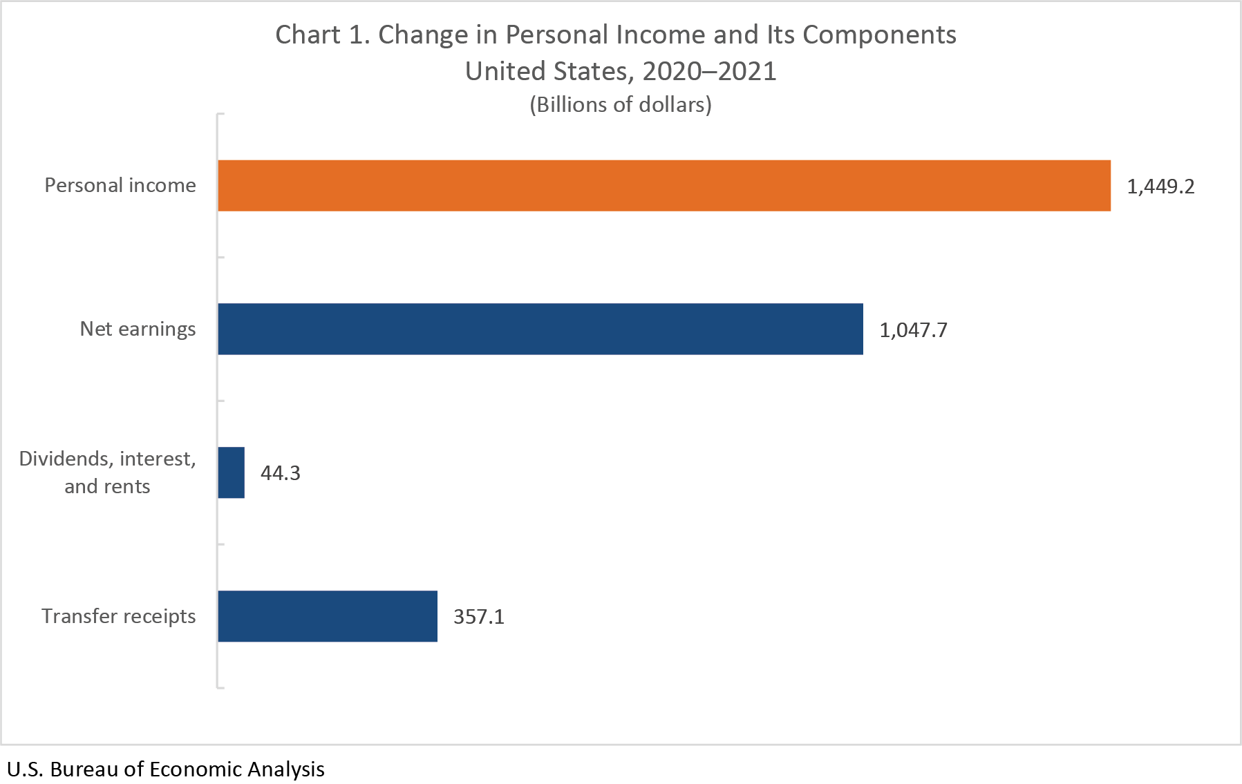 Earnings. Earnings increased 8.9 percent, accounting for most of the $1.4 trillion dollar increase in personal income for the nation in 2021 (chart 1). The increase in earnings reflected the continuing reopening of the economy following the onset of the COVID-19 pandemic in the first quarter of 2020.
