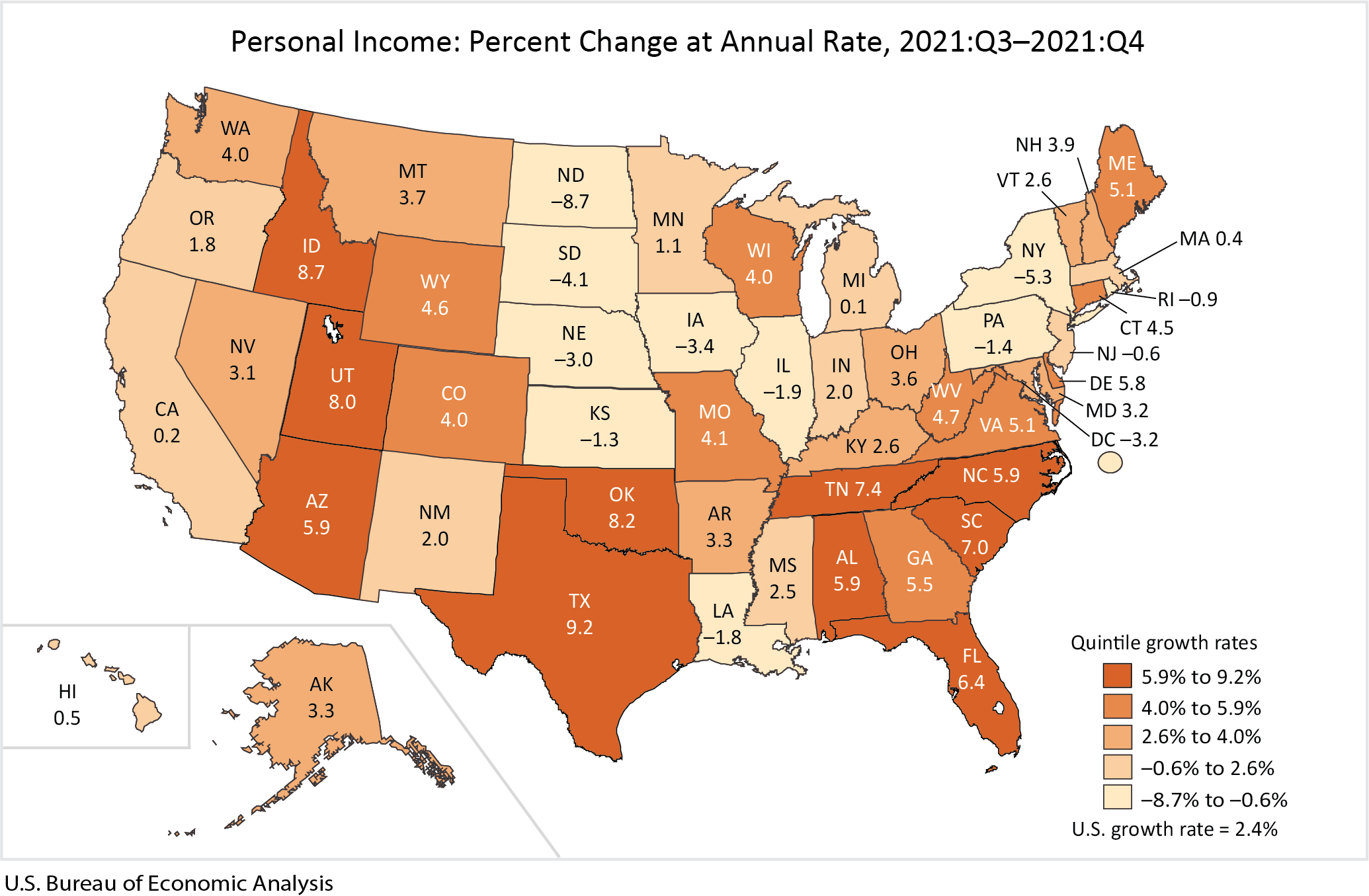 State personal income increased 2.4 percent at an annual rate in the fourth quarter of 2021 after increasing 3.0 percent in the third quarter (table 5). Increases in earnings and property income were partially offset by decreases in transfer receipts. The decrease in transfer receipts reflected lower state unemployment insurance compensation payments. The percent change in personal income across all states ranged from 9.2 percent in Texas to –8.7 percent in North Dakota (table 6).