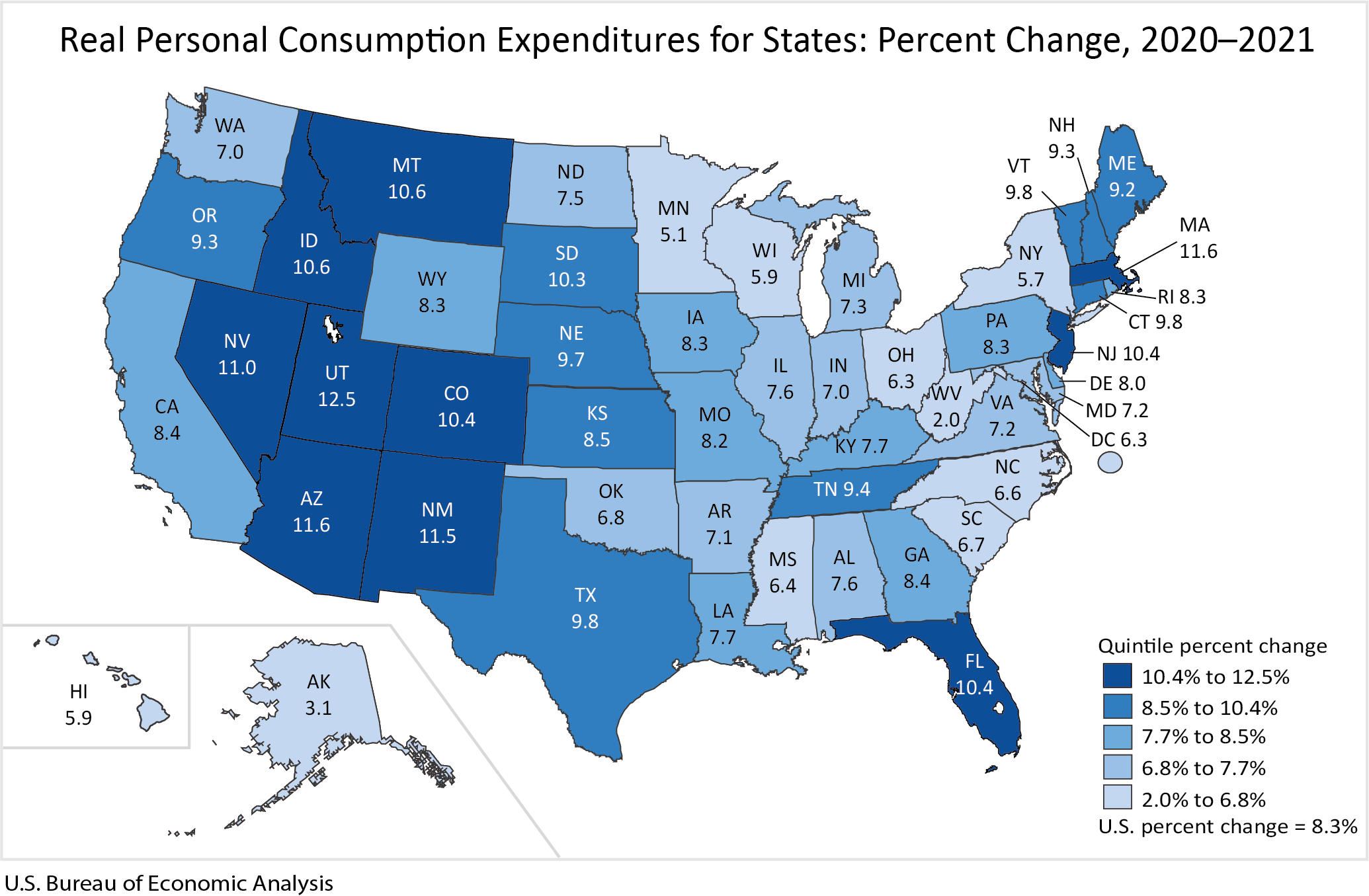 Real personal consumption expenditures (PCE) by state increased in all 50 states and the District of Columbia in 2021, according to statistics released today by the U.S. Bureau of Economic Analysis (BEA). The percent change in real PCE across all 50 states and the District of Columbia ranged from 12.5 percent in Utah to 2.0 percent in West Virginia (table 1).