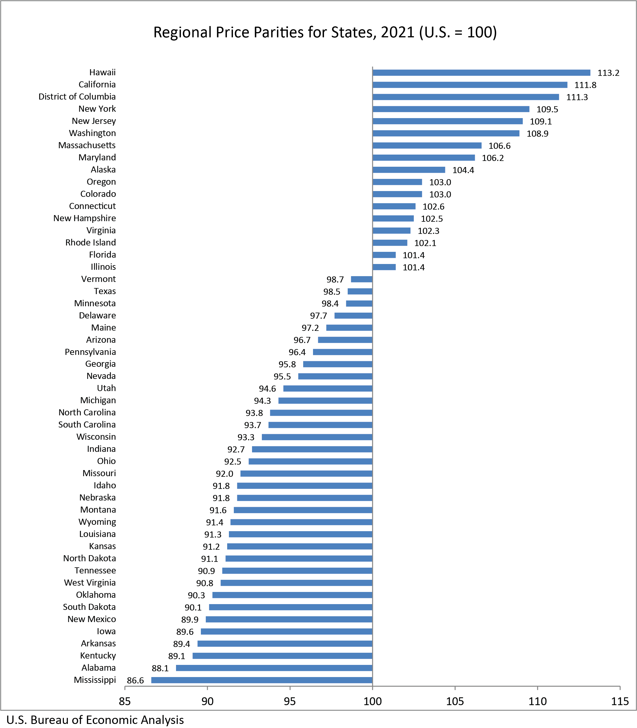 Regional price parities (RPPs) measure the differences in price levels across states for a given year and are expressed as a percentage of the overall national price level.