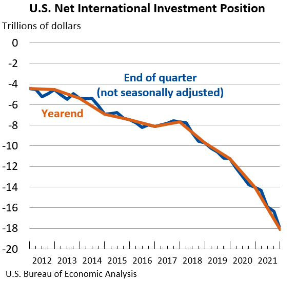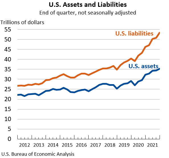The U.S. net international investment position (IIP), the difference between U.S. residents’ foreign financial assets and liabilities, was –$18.10 trillion at the end of the fourth quarter of 2021, according to statistics released today by the U.S. Bureau of Economic Analysis (BEA). Assets totaled $35.21 trillion, and liabilities were $53.31 trillion. At the end of the third quarter, the net investment position was –$16.35 trillion. The net investment positions and components of assets and liabilities are presented in table 1.