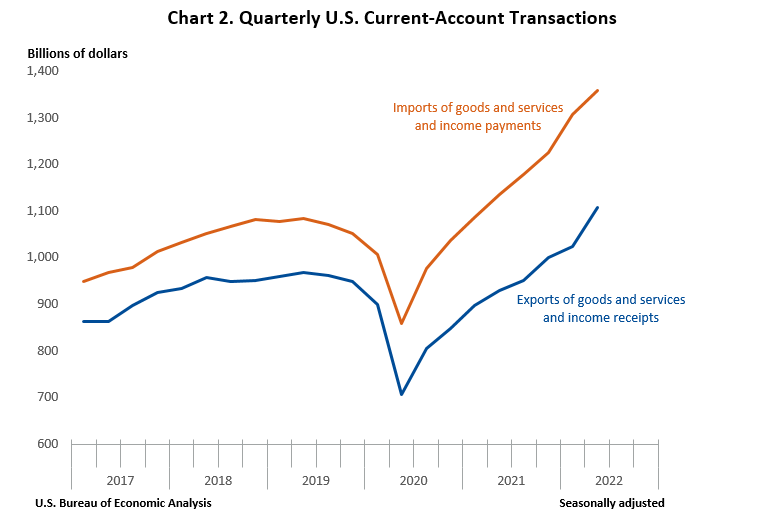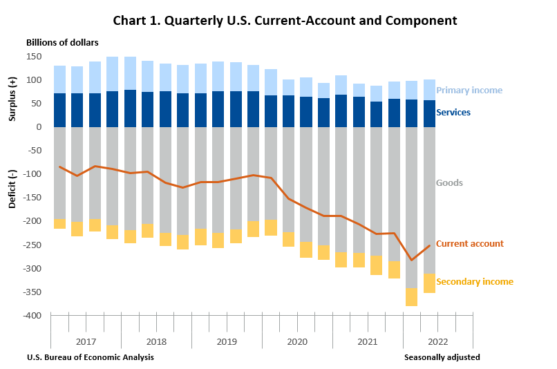 The U.S. current-account deficit, which reflects the combined balances on trade in goods and services and income flows between U.S. residents and residents of other countries, narrowed by $31.5 billion, or 11.1 percent, to $251.1 billion in the second quarter of 2022, according to statistics released today by the U.S. Bureau of Economic Analysis. The revised first-quarter deficit was $282.5 billion.
