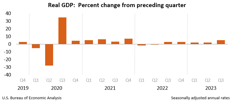 Real gross domestic product (GDP) increased at an annual rate of 5.2 percent in the third quarter of 2023 (table 1), according to the "second" estimate released by the Bureau of Economic Analysis. In the second quarter, real GDP increased 2.1 percent.