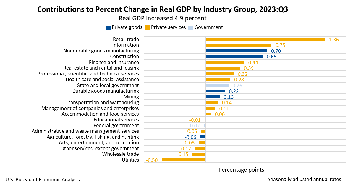 Today’s release includes estimates of GDP by industry, or value added—a measure of an industry’s contribution to GDP. Private goods-producing industries increased 10.2 percent, private services-producing industries increased 4.1 percent, and government increased 2.0 percent (table 12). Overall, 14 of 22 industry groups contributed to the third-quarter increase in real GDP.