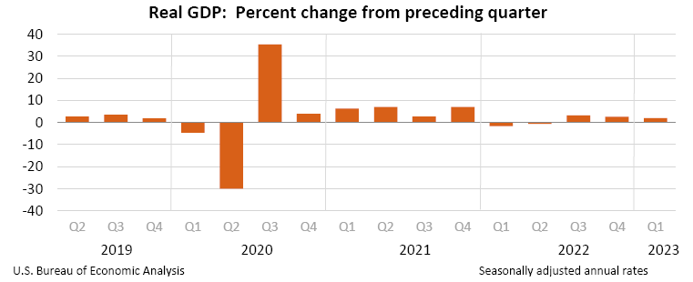 Real gross domestic product (GDP) increased at an annual rate of 2.0 percent in the first quarter of 2023 (table 1), according to the "third" estimate released by the Bureau of Economic Analysis. In the fourth quarter, real GDP increased 2.6 percent.